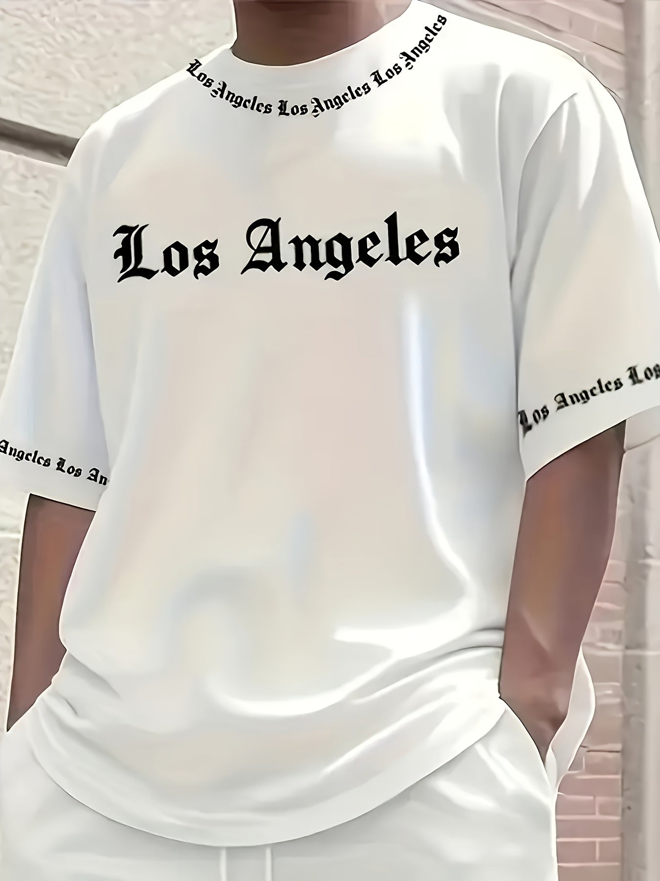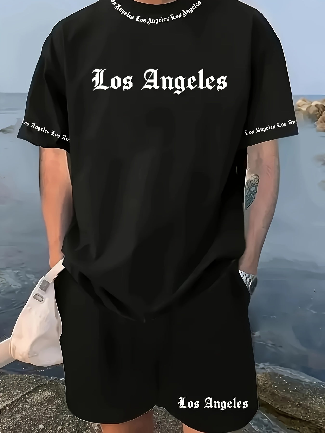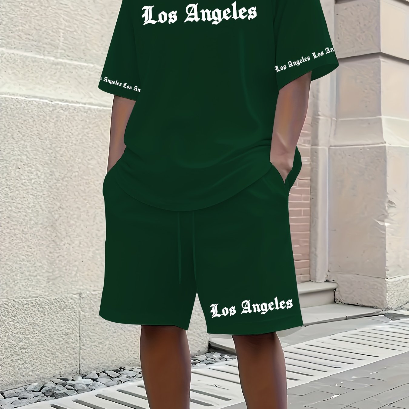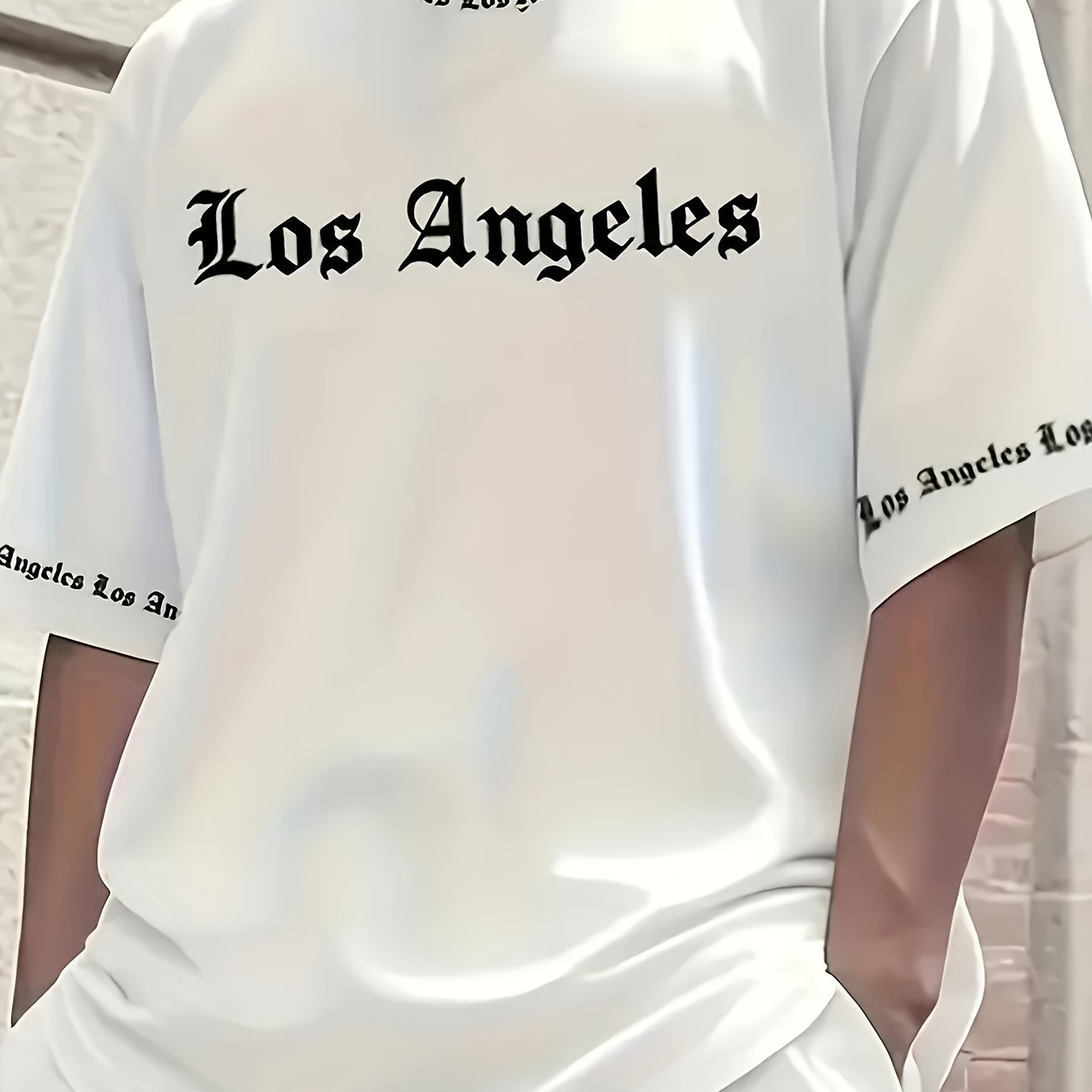 T-shirt grafica casual da uomo con stampa 3D "Los Angeles" - morbida e traspirante, con pantaloncini con coulisse e tasche, abbigliamento estivo casual|T-shirt grafica|Abito comodo, abbigliamento Los Angeles