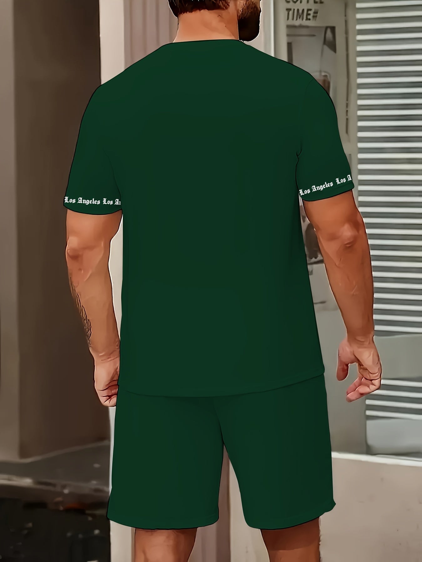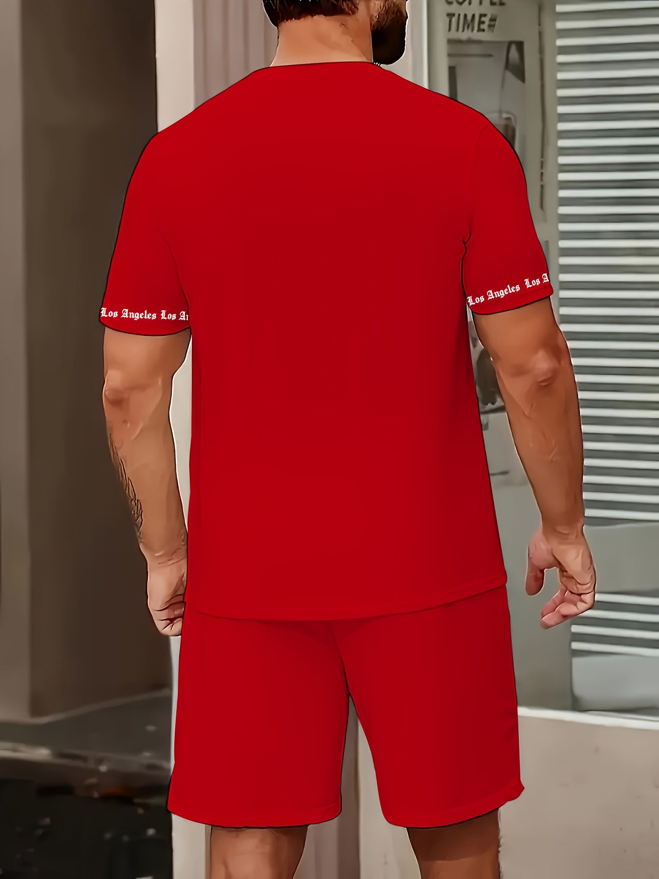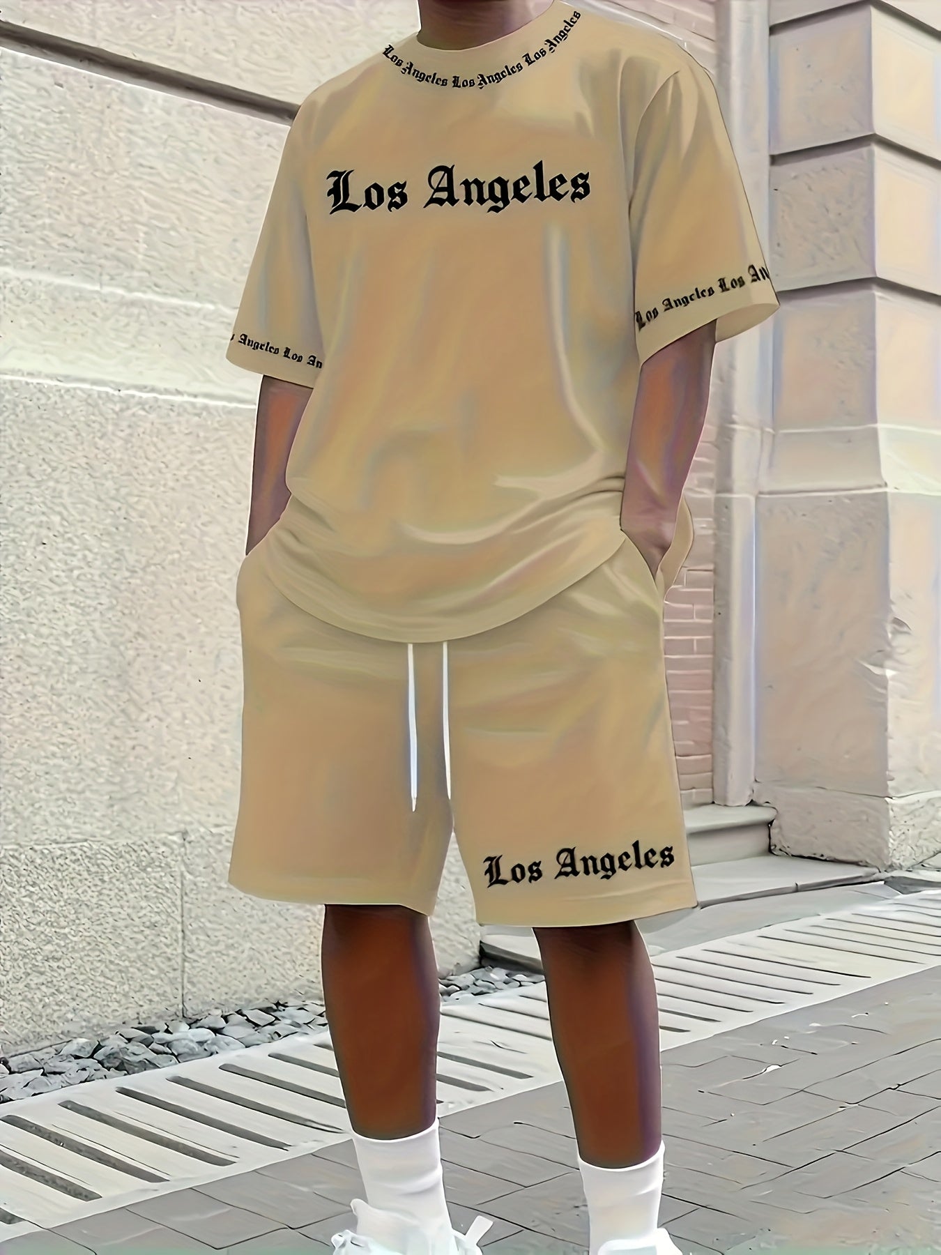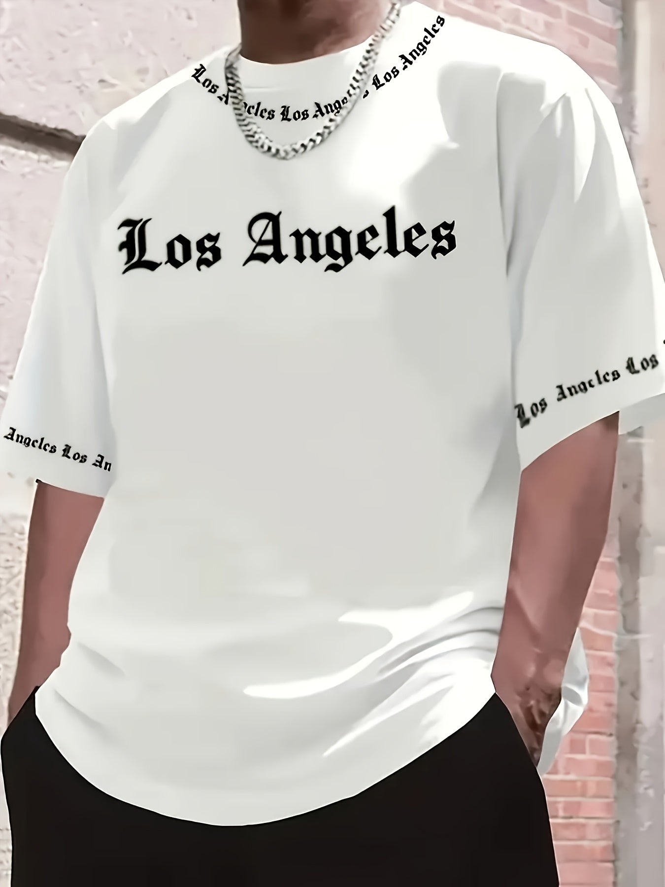 T-shirt grafica casual da uomo con stampa 3D "Los Angeles" - morbida e traspirante, con pantaloncini con coulisse e tasche, abbigliamento estivo casual|T-shirt grafica|Abito comodo, abbigliamento Los Angeles