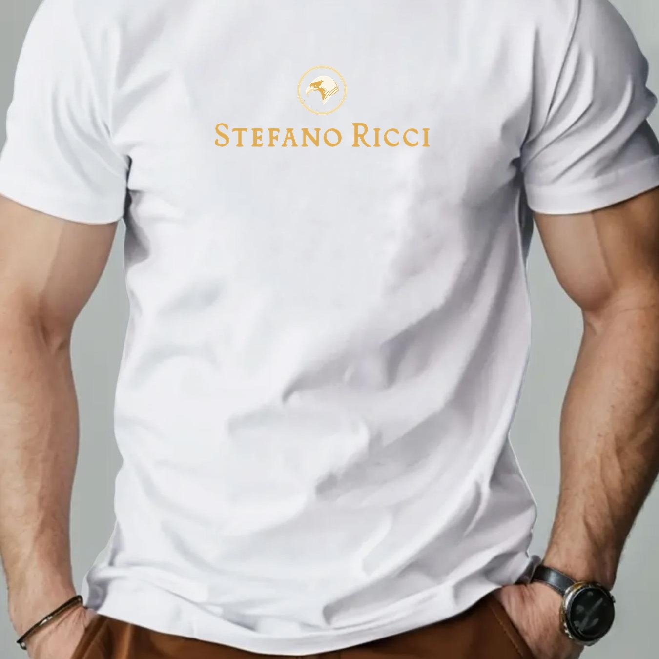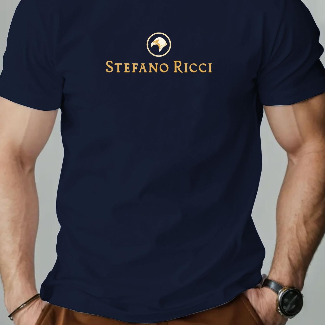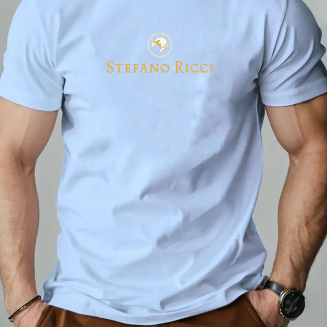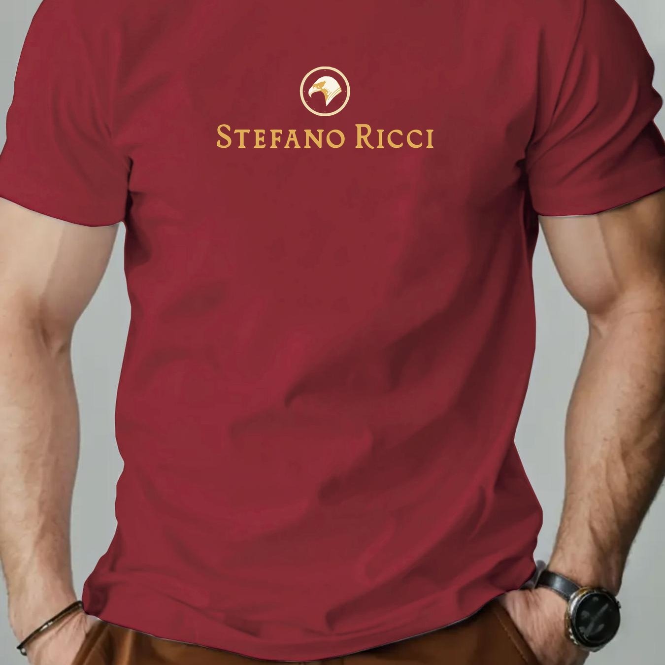 T-shirt grafica con logo Stefano Ricci per uomo - T-shirt casual estiva rossa con design circolare dorato, scollo rotondo, manica corta, vestibilità regolare per adulti, abbigliamento casual elegante | T-shirt grafica con logo | Tessuto in