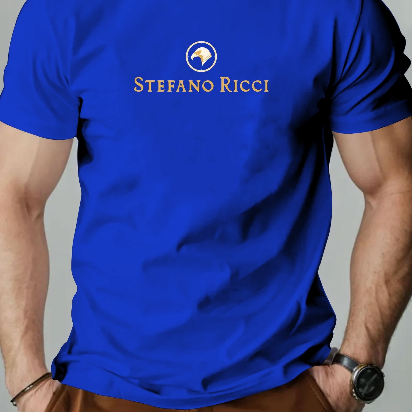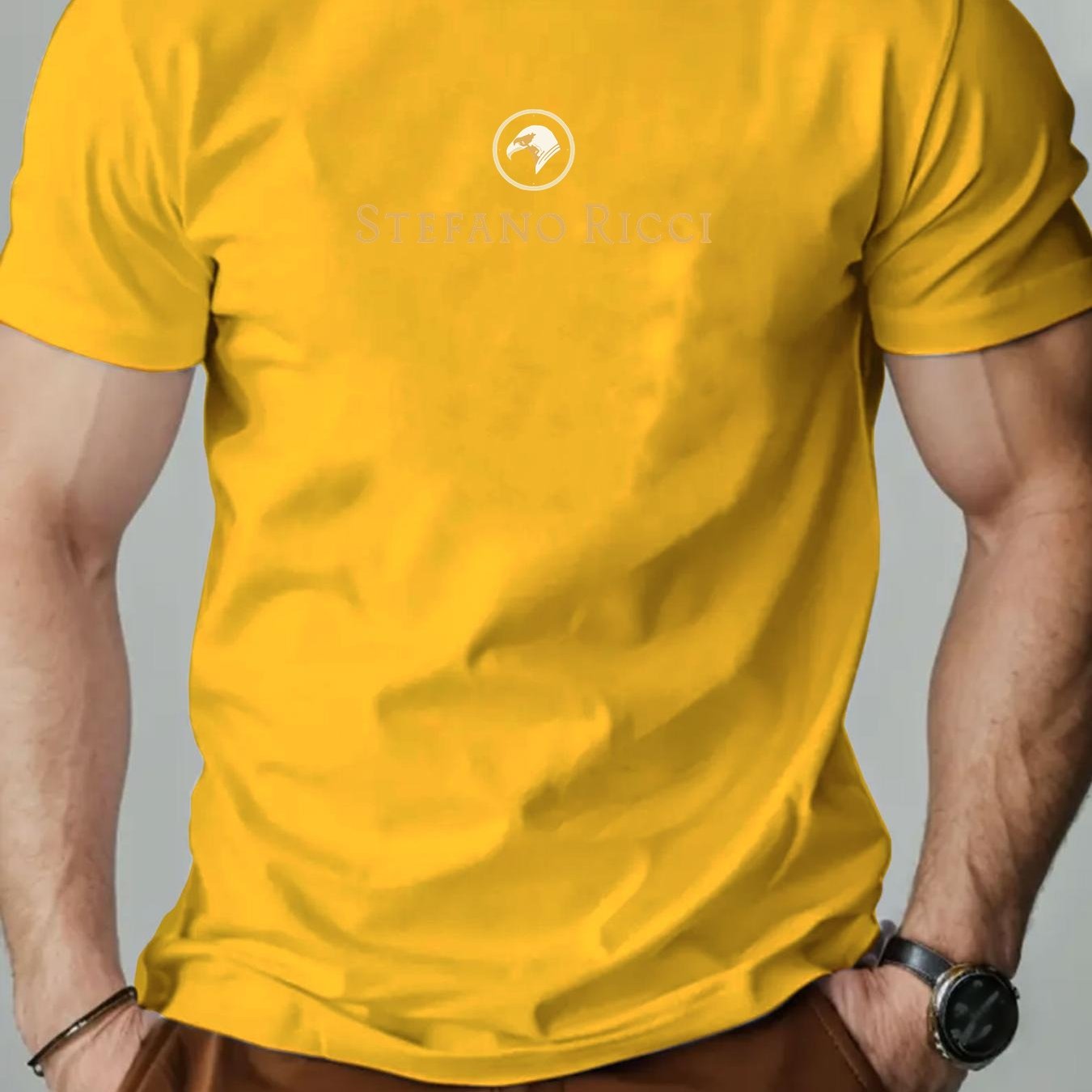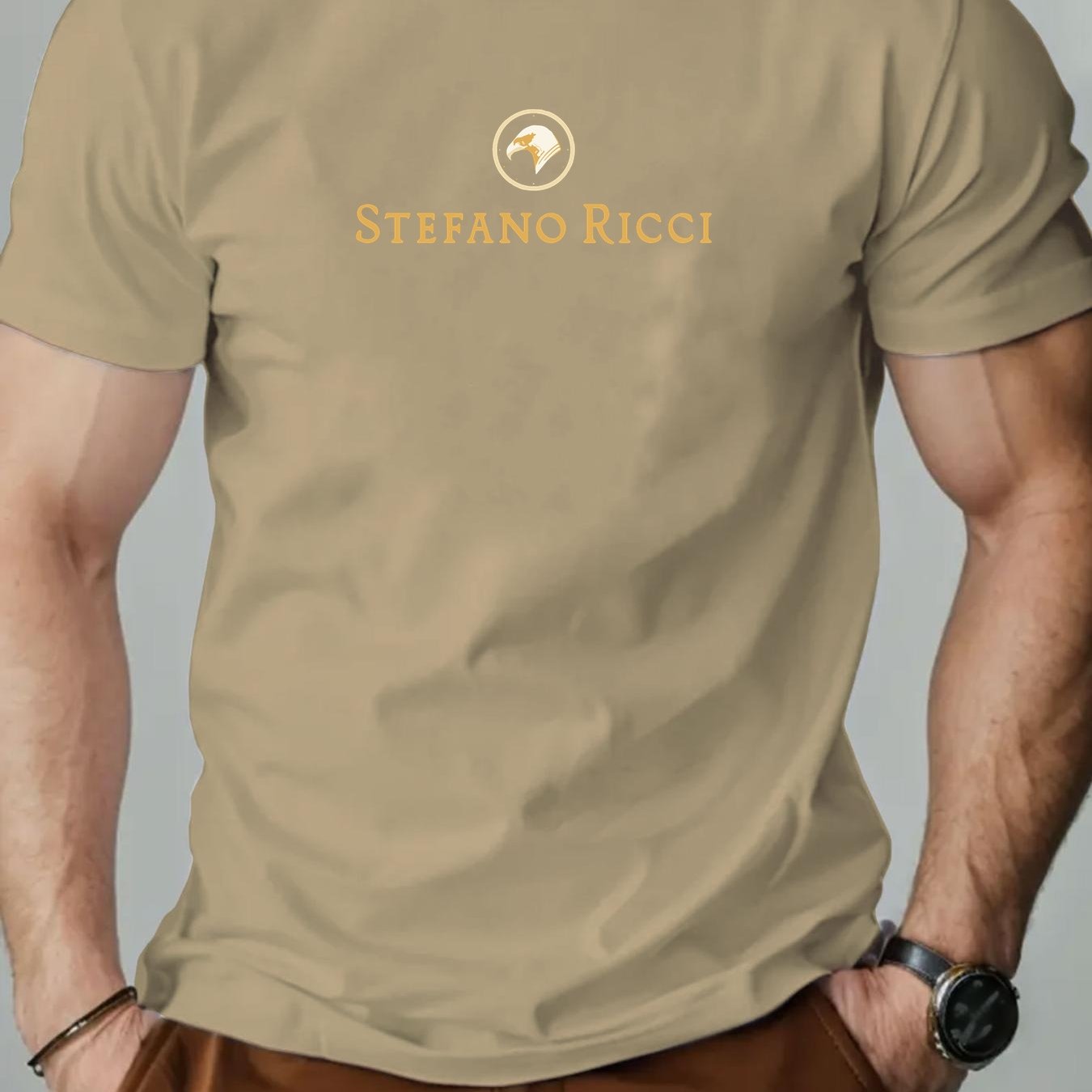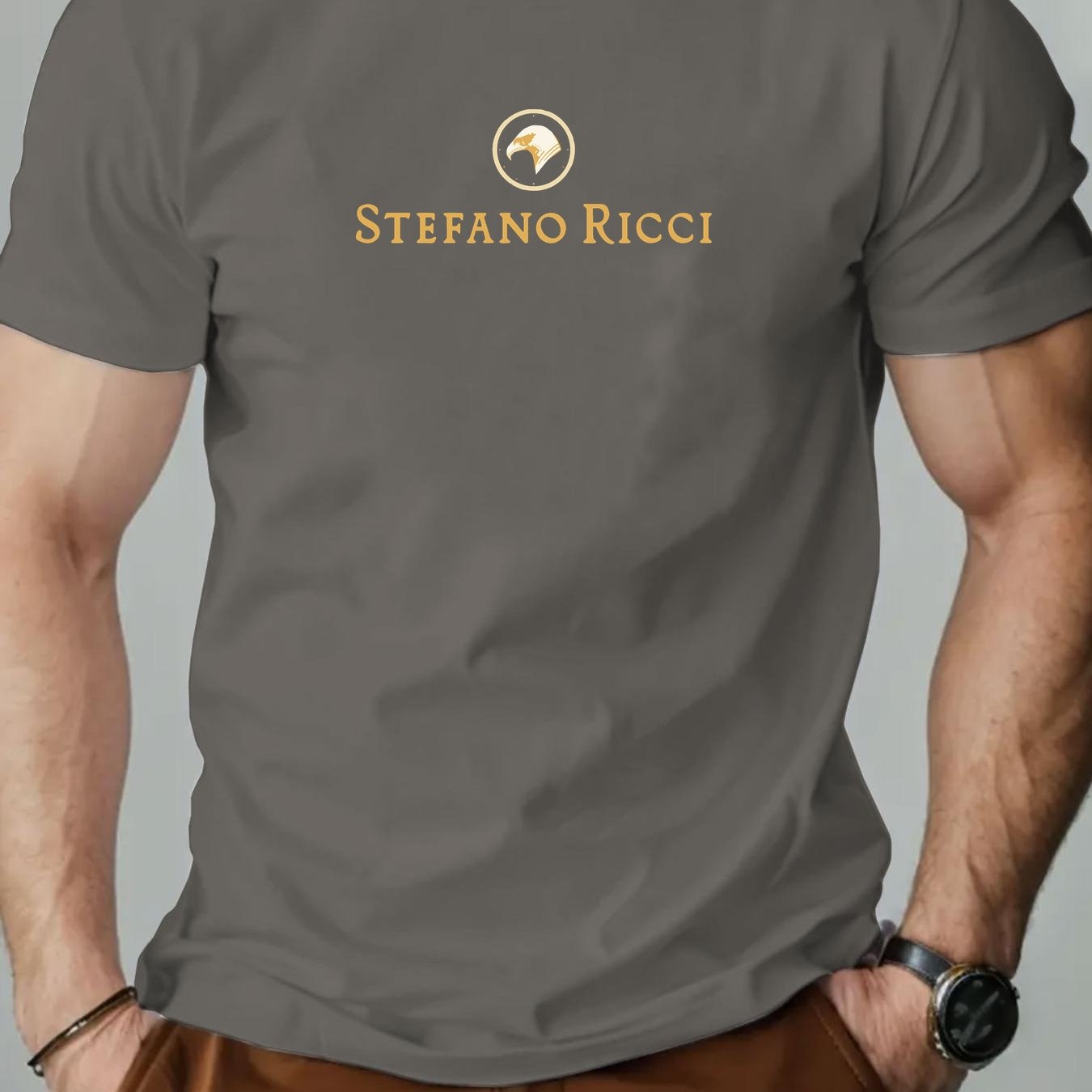 T-shirt grafica con logo Stefano Ricci per uomo - T-shirt casual estiva rossa con design circolare dorato, scollo rotondo, manica corta, vestibilità regolare per adulti, abbigliamento casual elegante | T-shirt grafica con logo | Tessuto in