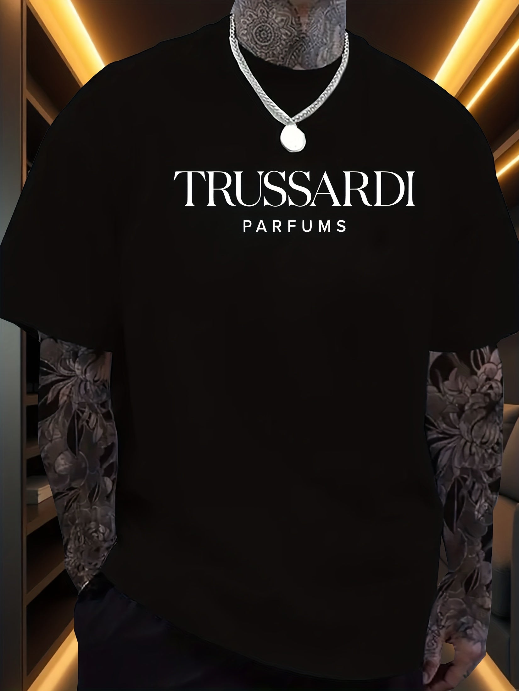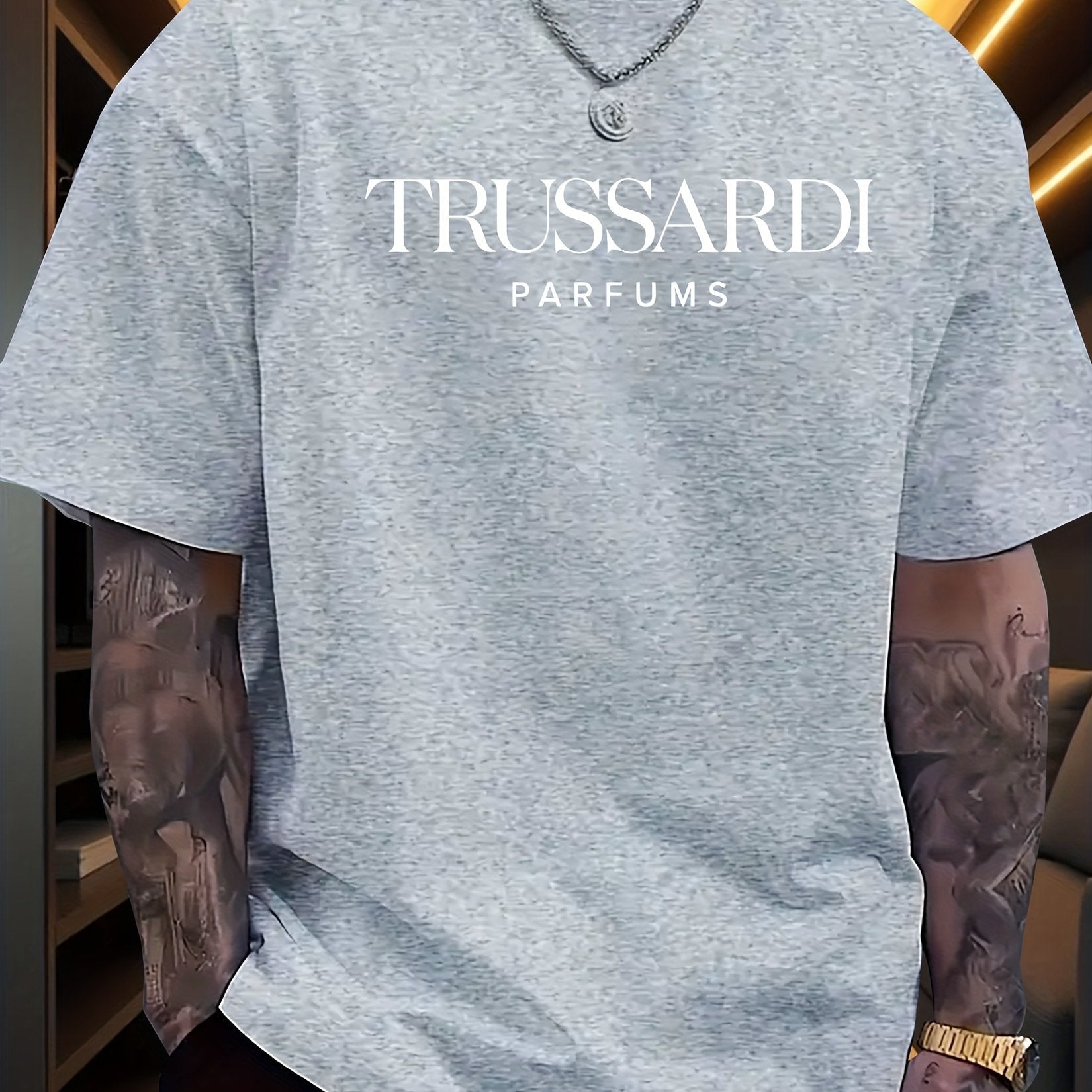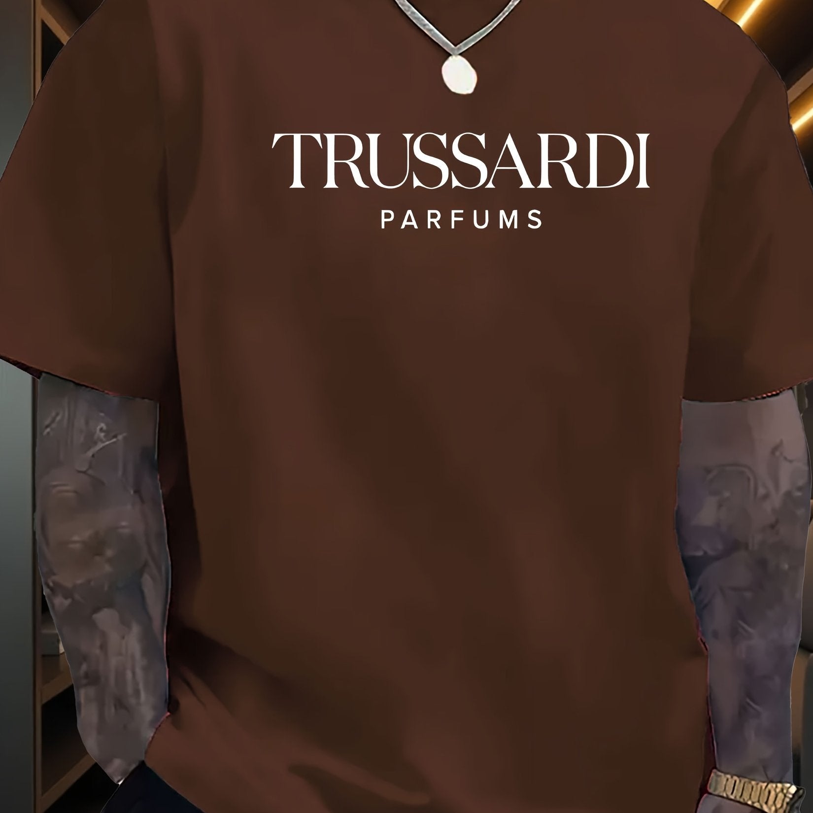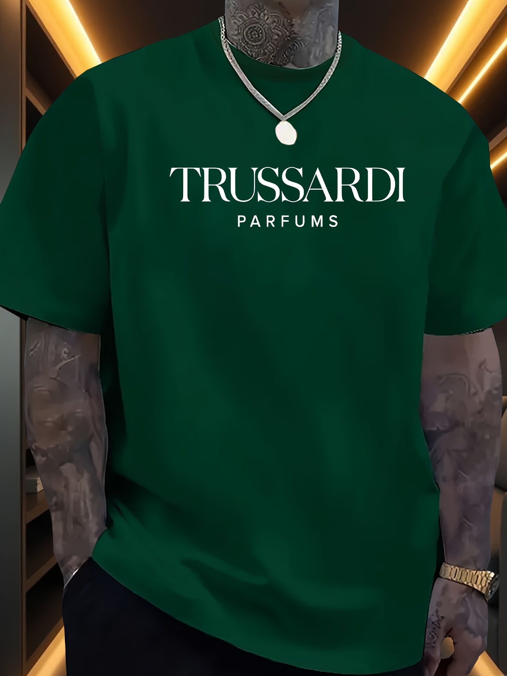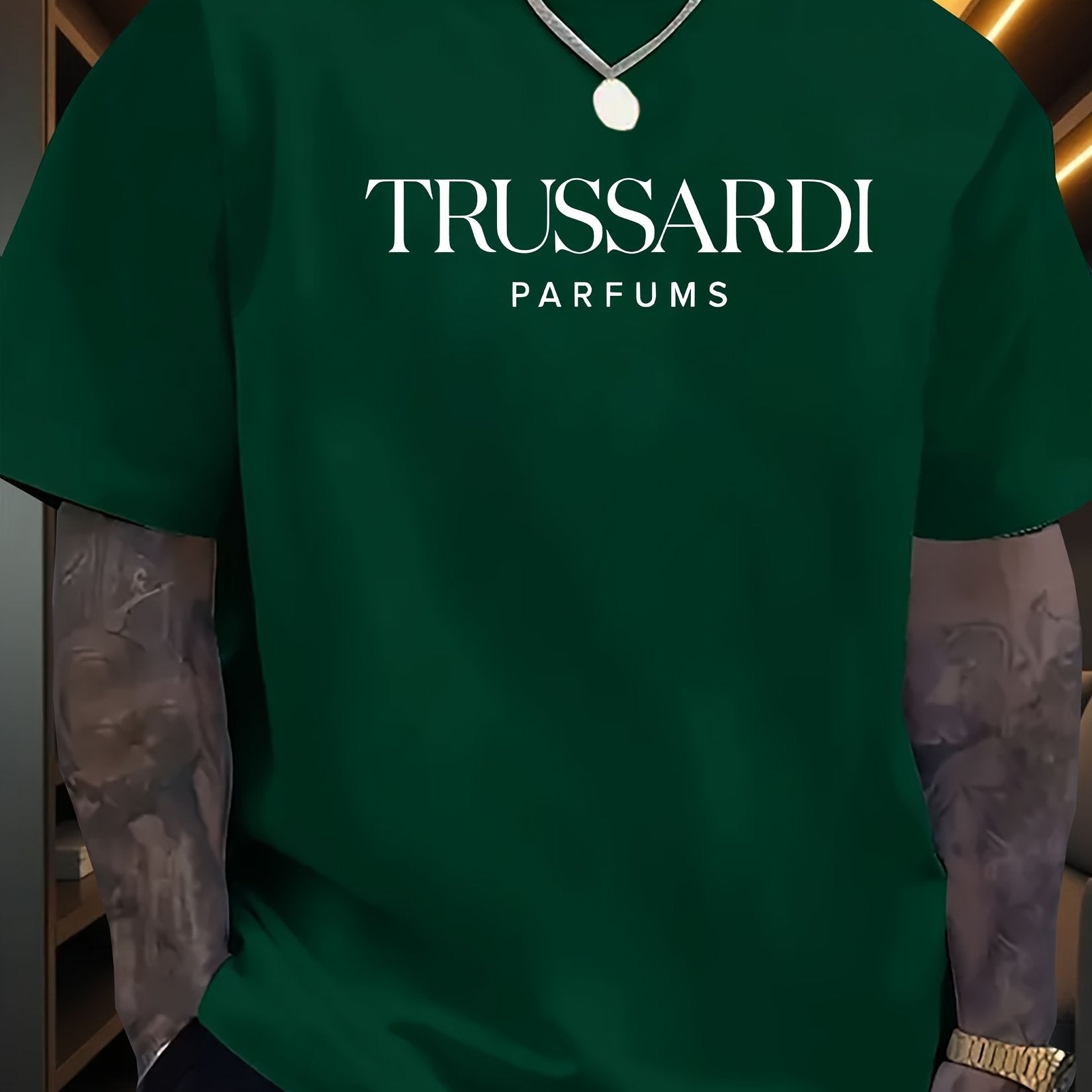 T-shirt grafica Trussardi Parfums per uomo - T-shirt casual verde a maniche corte con stampa bianca audace, abbigliamento estivo confortevole, vestibilità regolare, scollo rotondo, tessuto leggero, T-shirt per tutti i giorni | T-shirt grafica audace | Ves