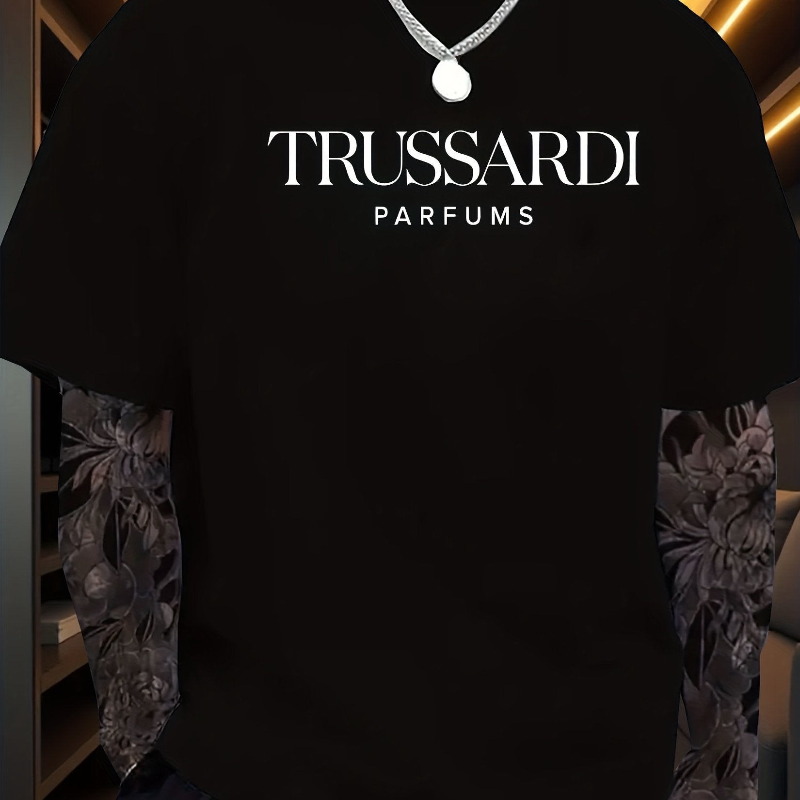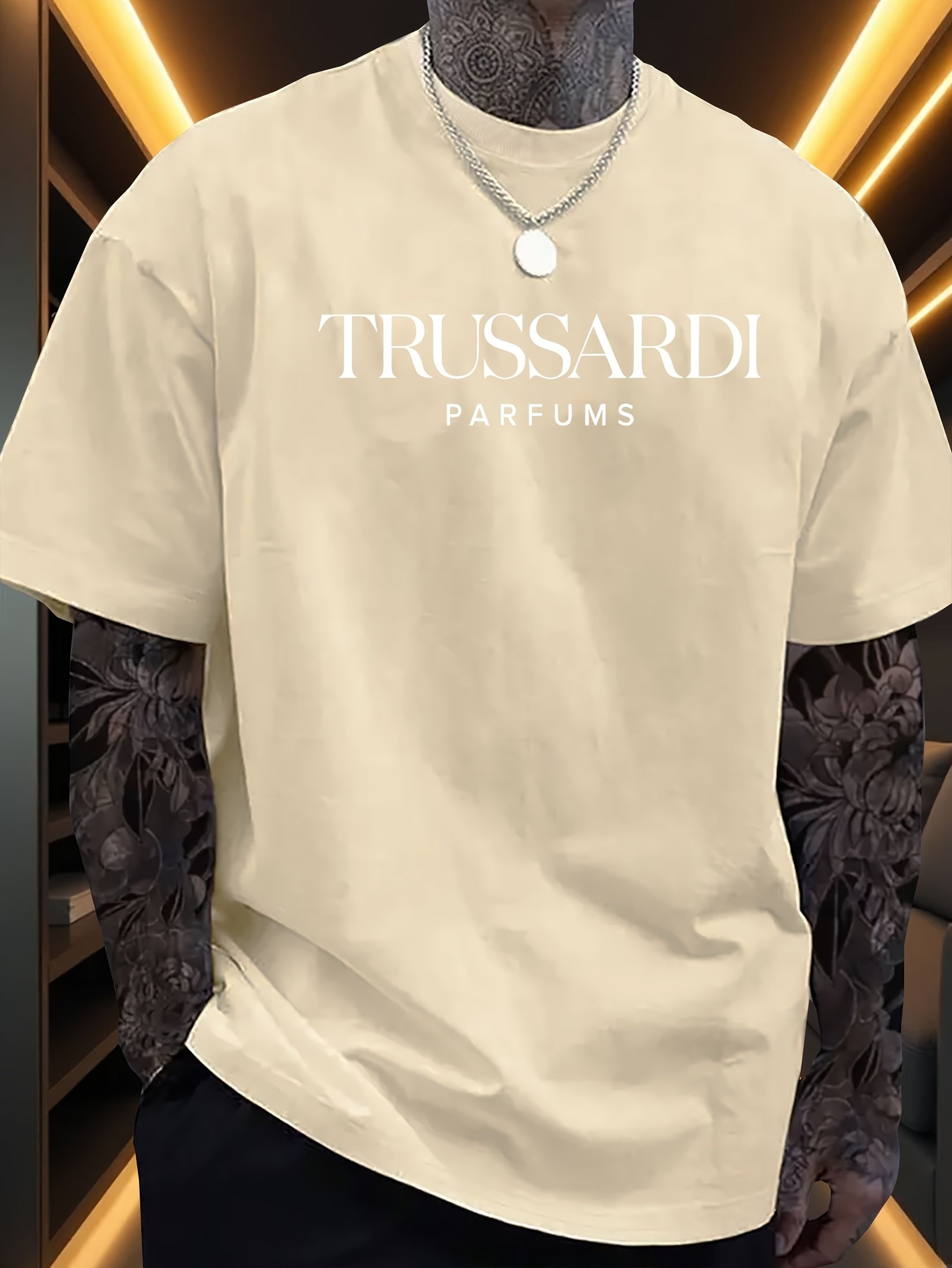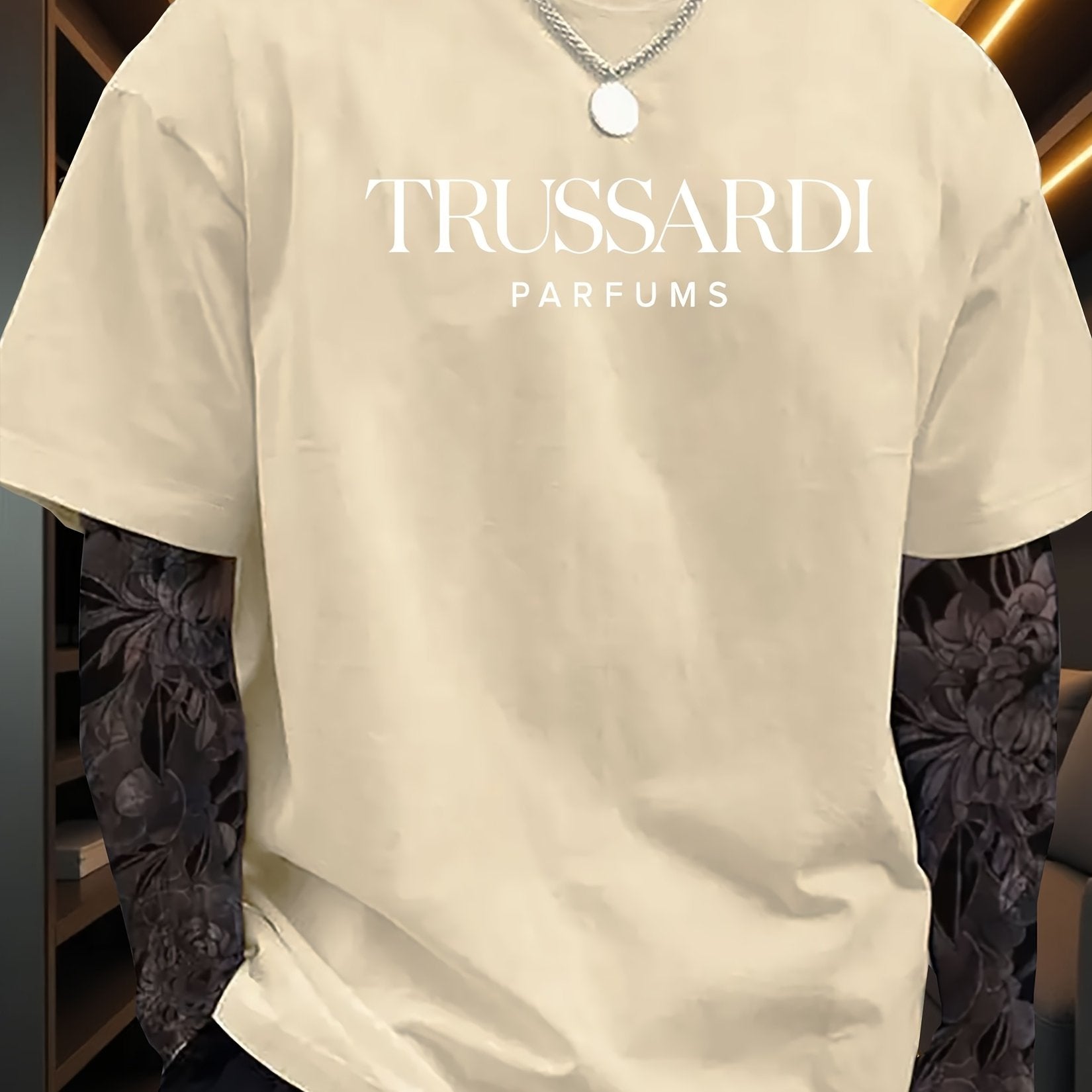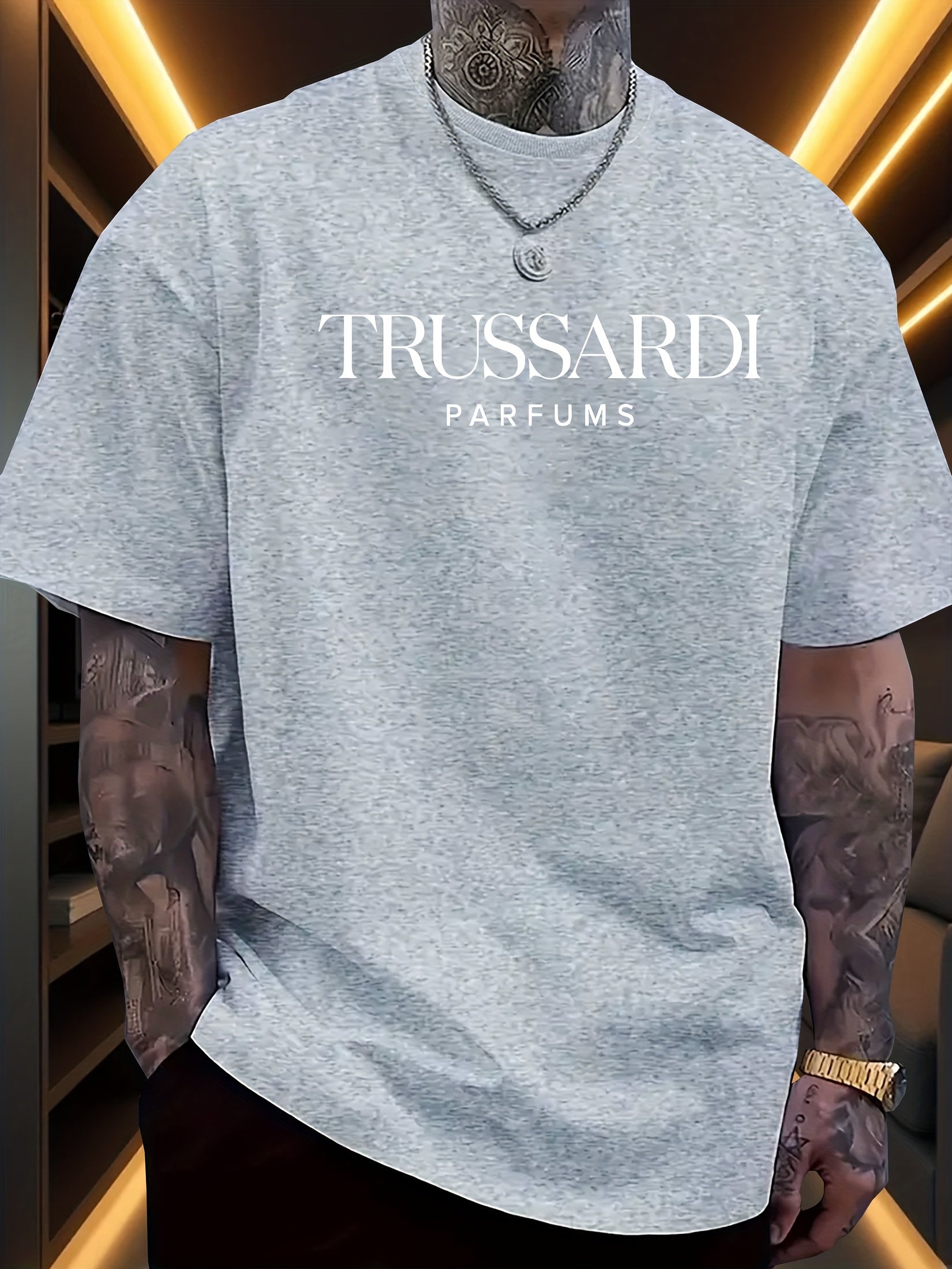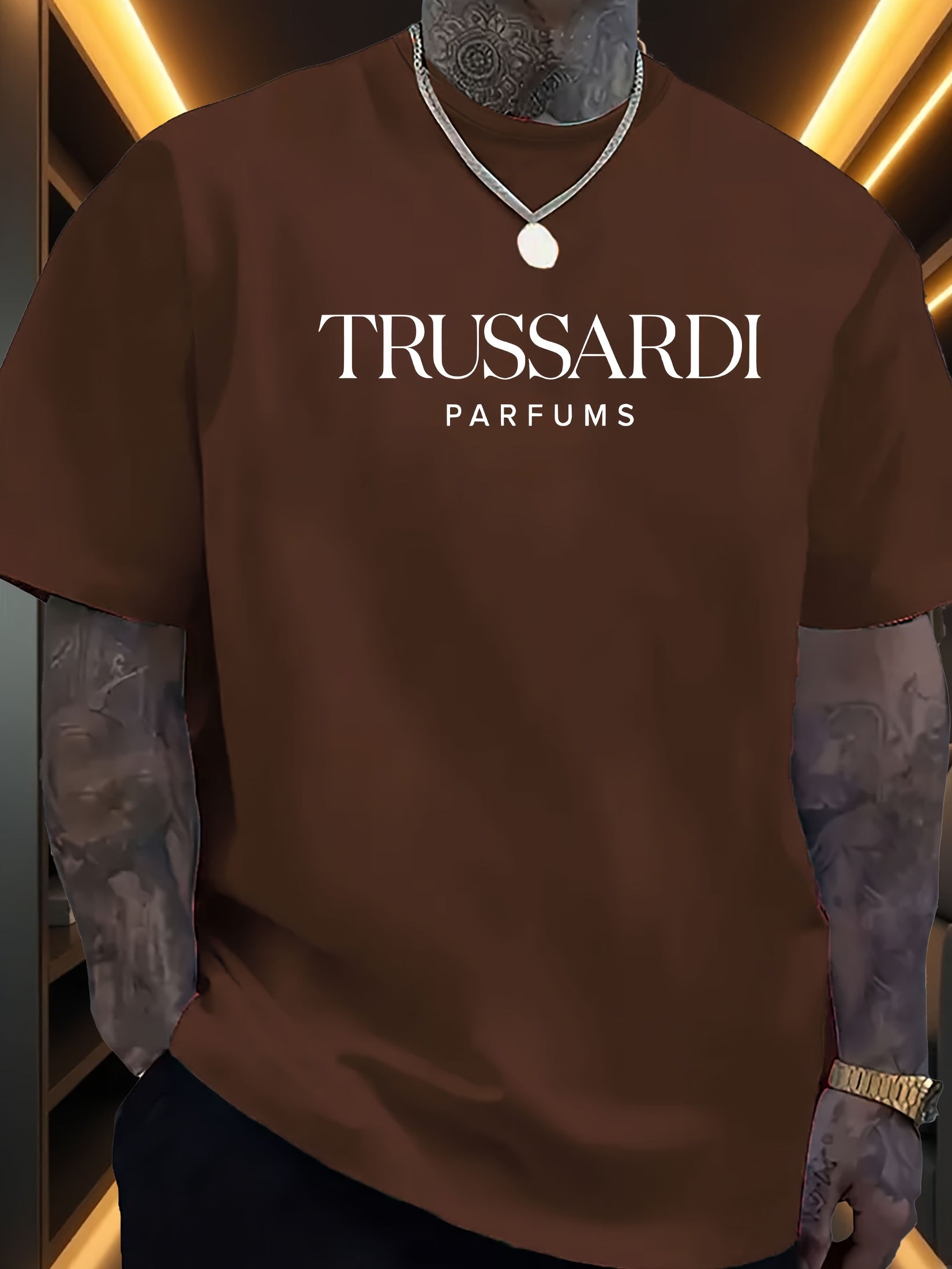 T-shirt grafica Trussardi Parfums per uomo - T-shirt casual verde a maniche corte con stampa bianca audace, abbigliamento estivo confortevole, vestibilità regolare, scollo rotondo, tessuto leggero, T-shirt per tutti i giorni | T-shirt grafica audace | Ves