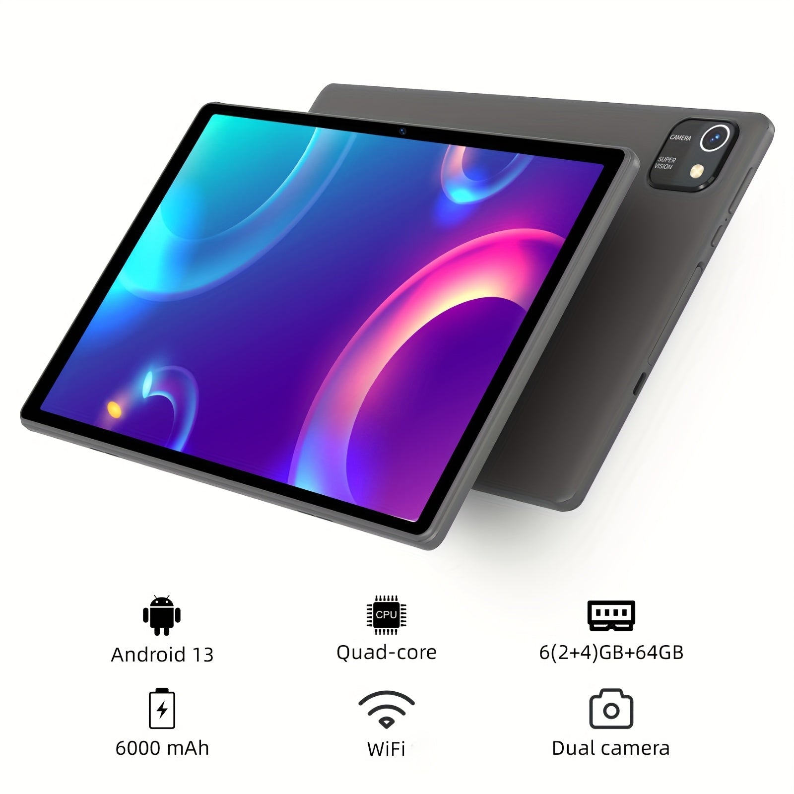 Tablet Android 13 da 10.1 pollici, 6GB (2GB+4GB di espansione) di RAM, 64GB di ROM, batteria da 6000mAh, dotato di processore quad-core, schermo IPS HD da 1280*800, doppie fotocamere, Wi-Fi, tablet, pad