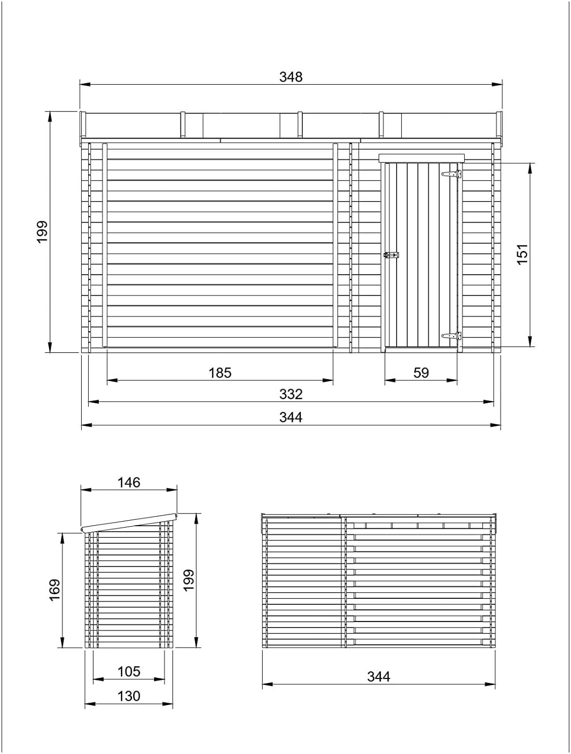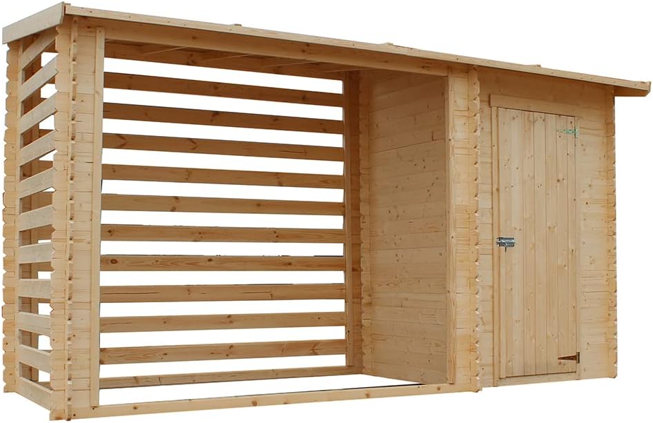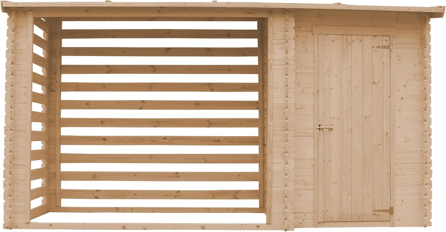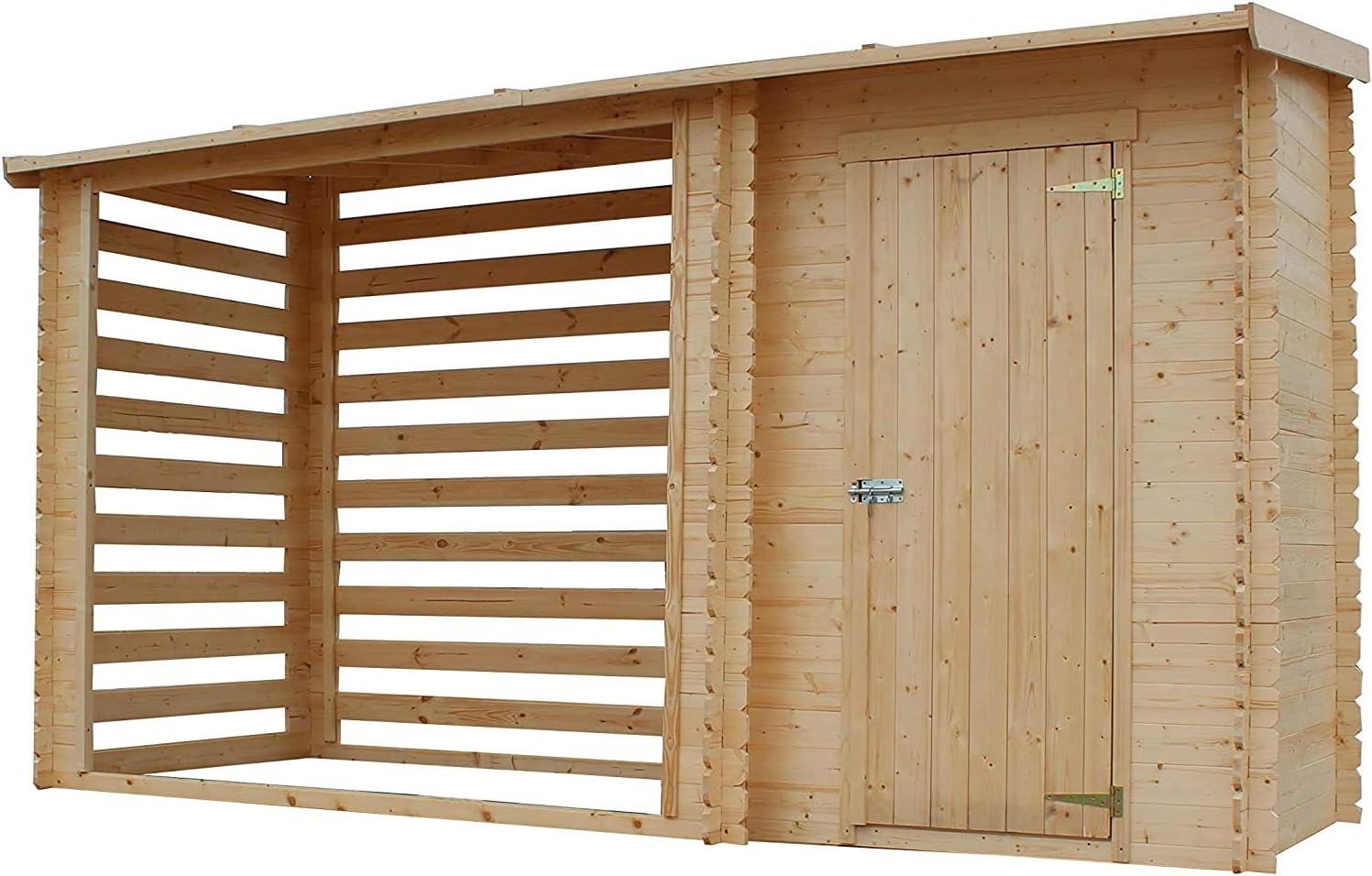 TIMBELA M205 Casetta da Giardino in Legno per Esterni con legnaia- A199x344x130 cm - 2,54 m2+1,1 m2 - Piccola Casetta in Legno, Rimessa Attrezzi, Deposito Bici