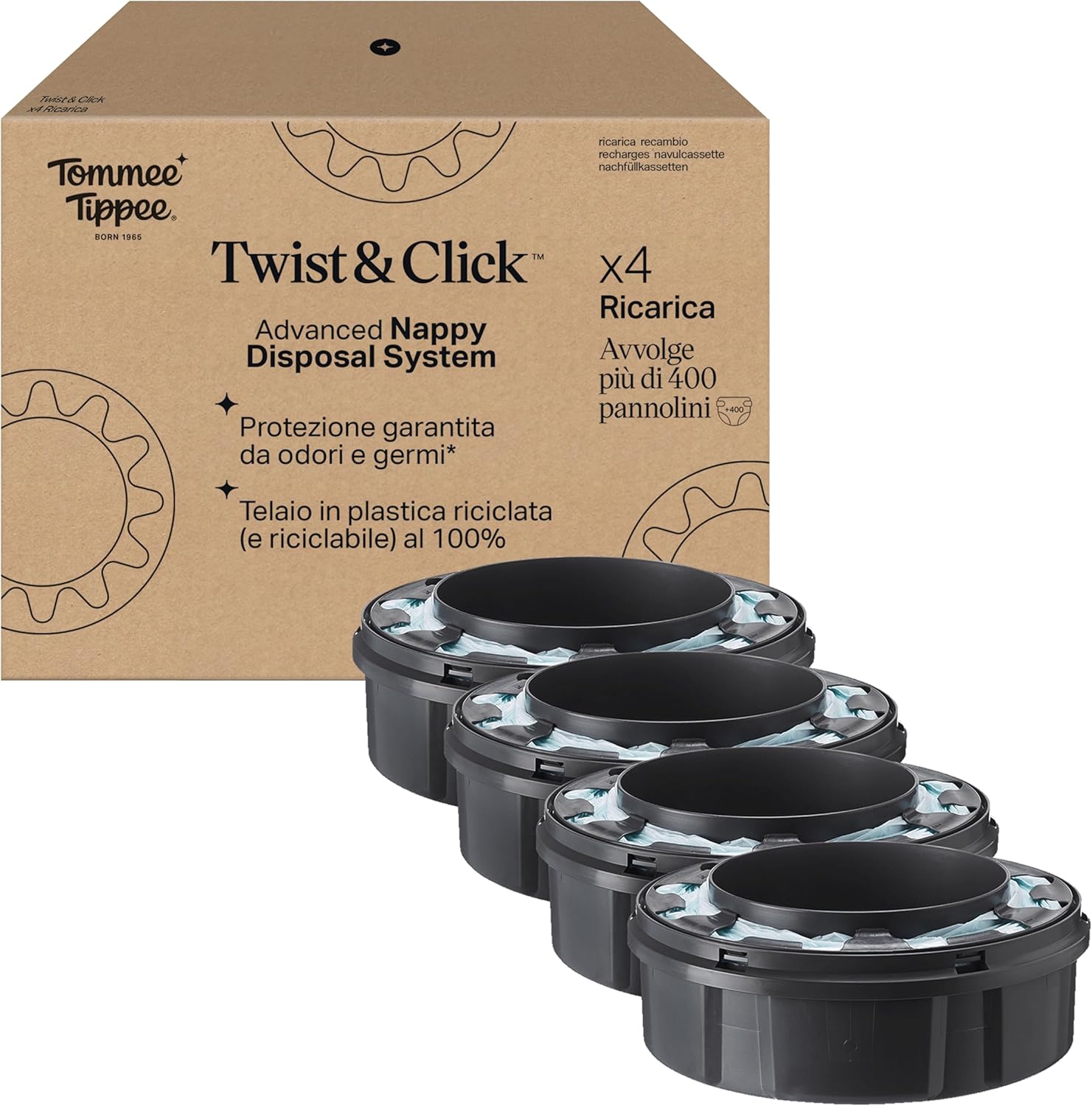 Tommee Tippee ricariche originali per Sistema Avanzato di Smaltimento Pannolini Twist and Click, confezione esclusiva da 4, per una ricarica facile e conveniente (la confezione può variare)
