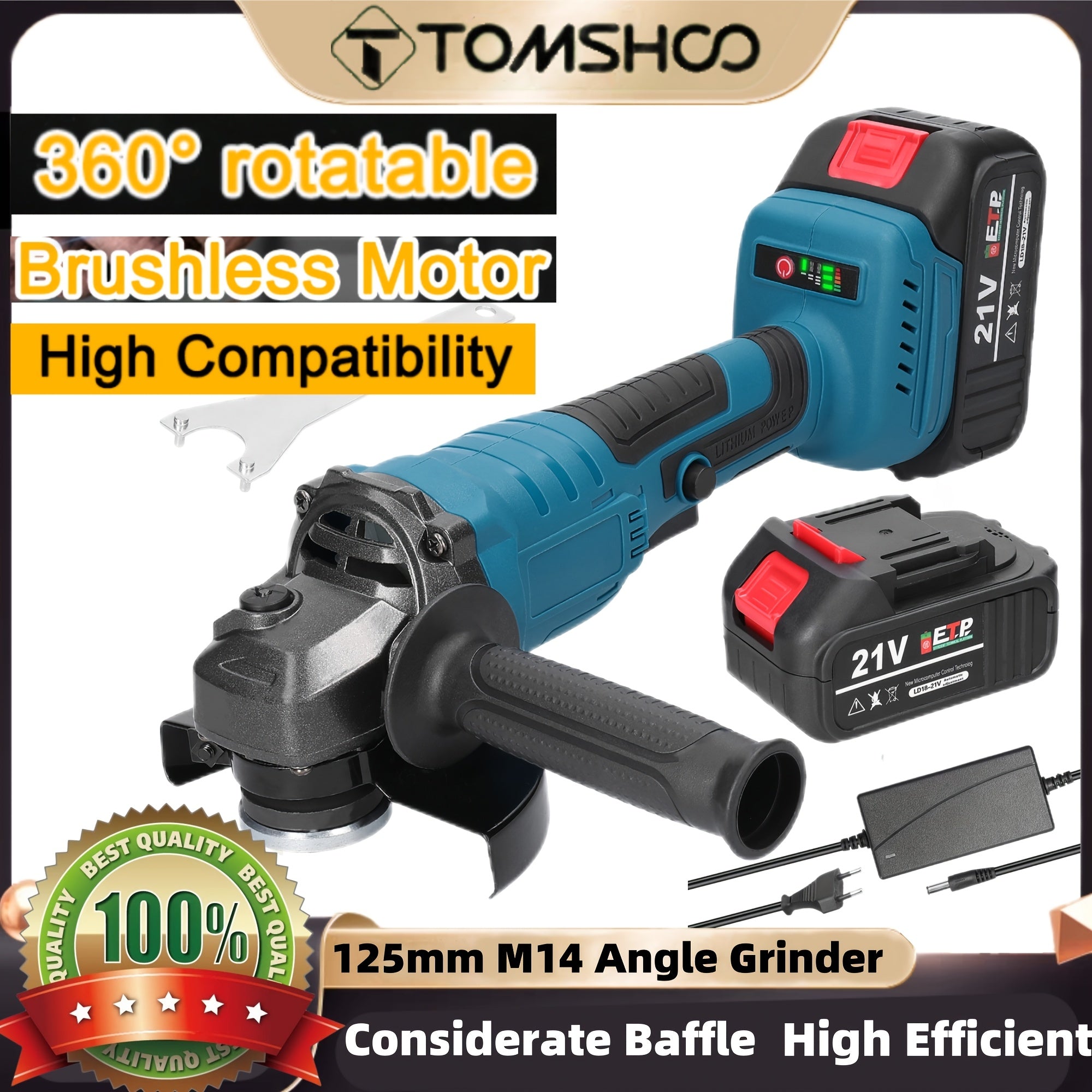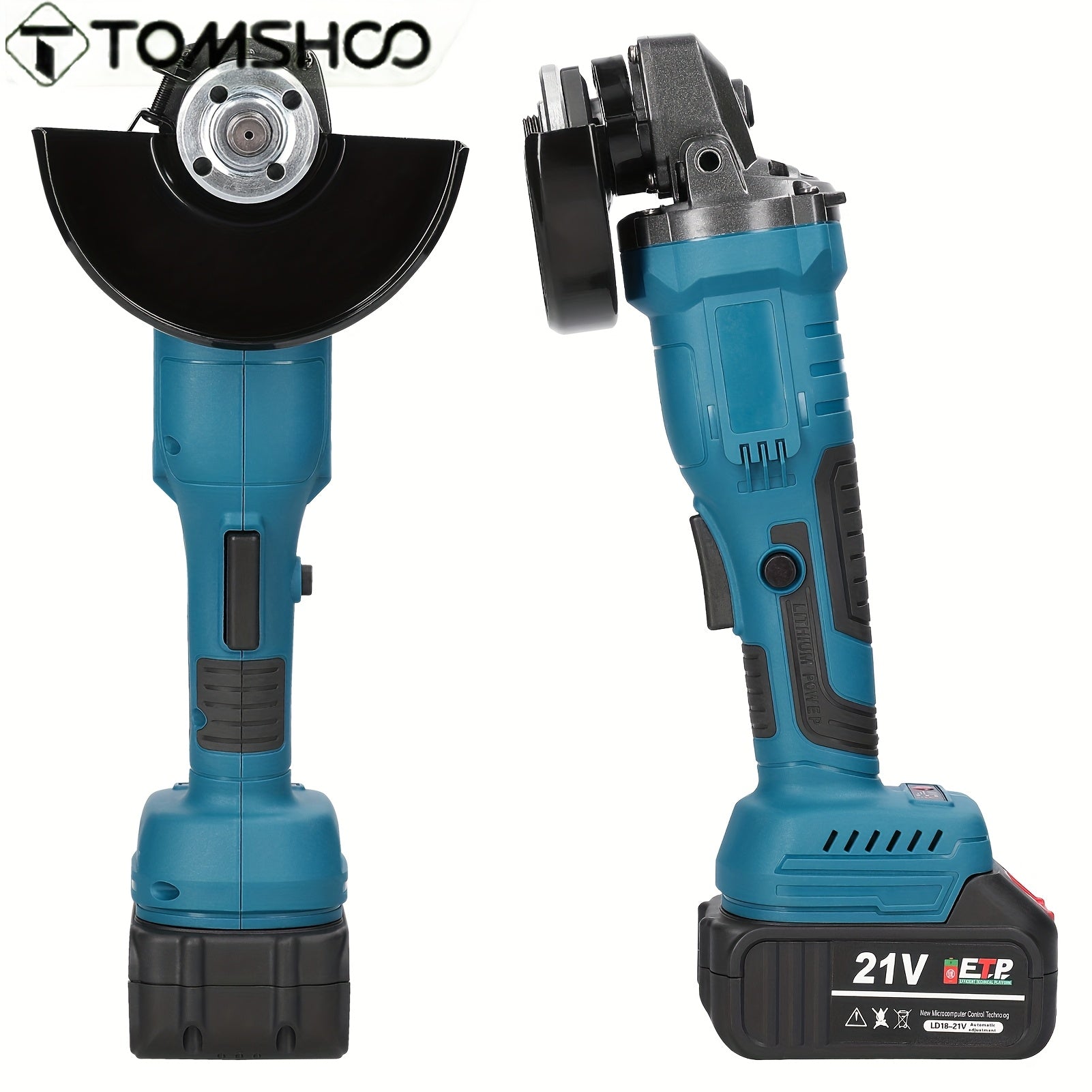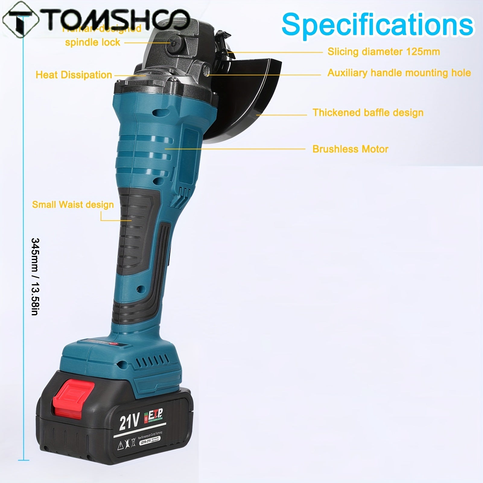 TOMSHOO 21V 125mm M14 Angolare senza spazzola, strumento di trapano ad alta efficienza alimentato da batteria al litio, corpo in ferro, leggero, con batterie ricaricabili, per lucidatura e trapano