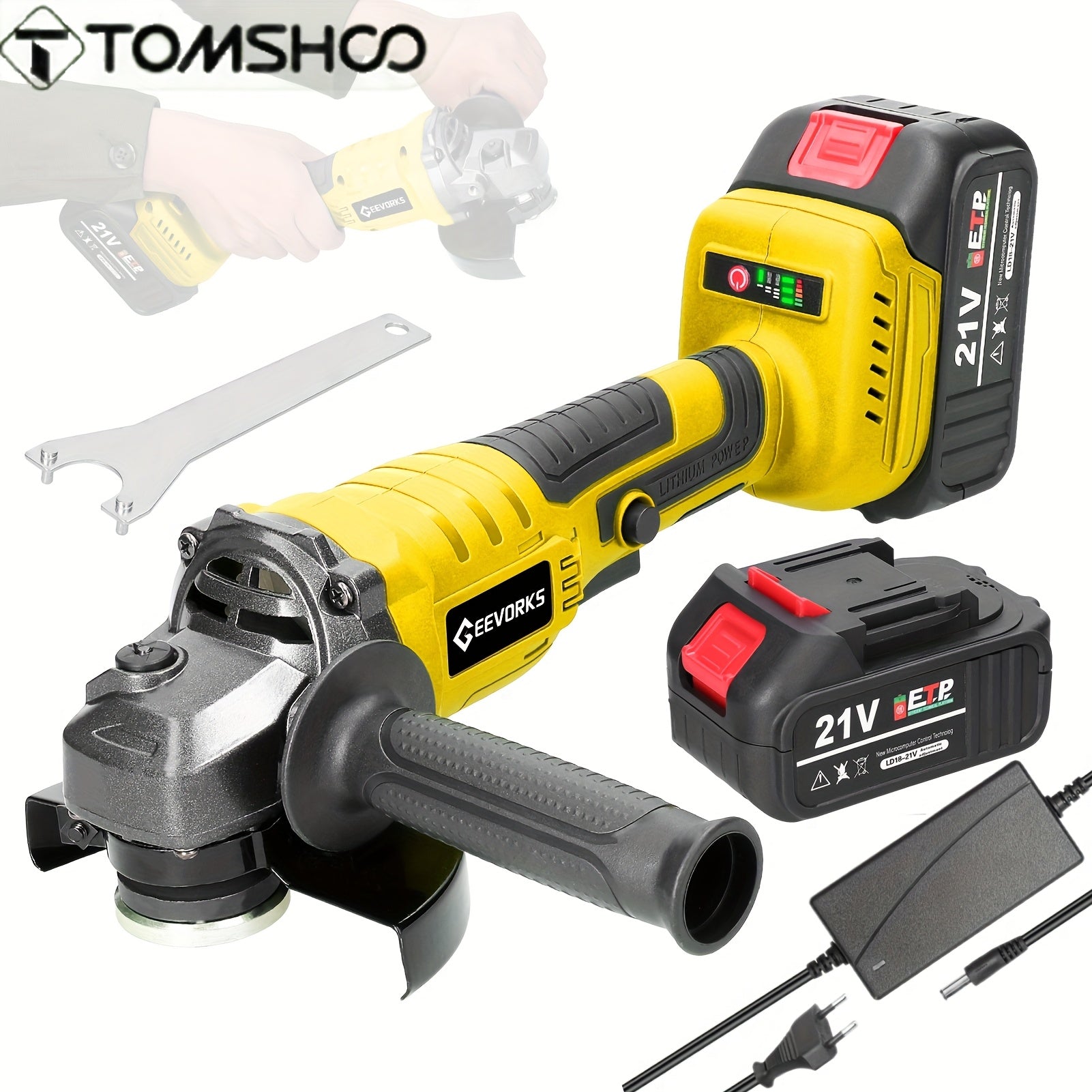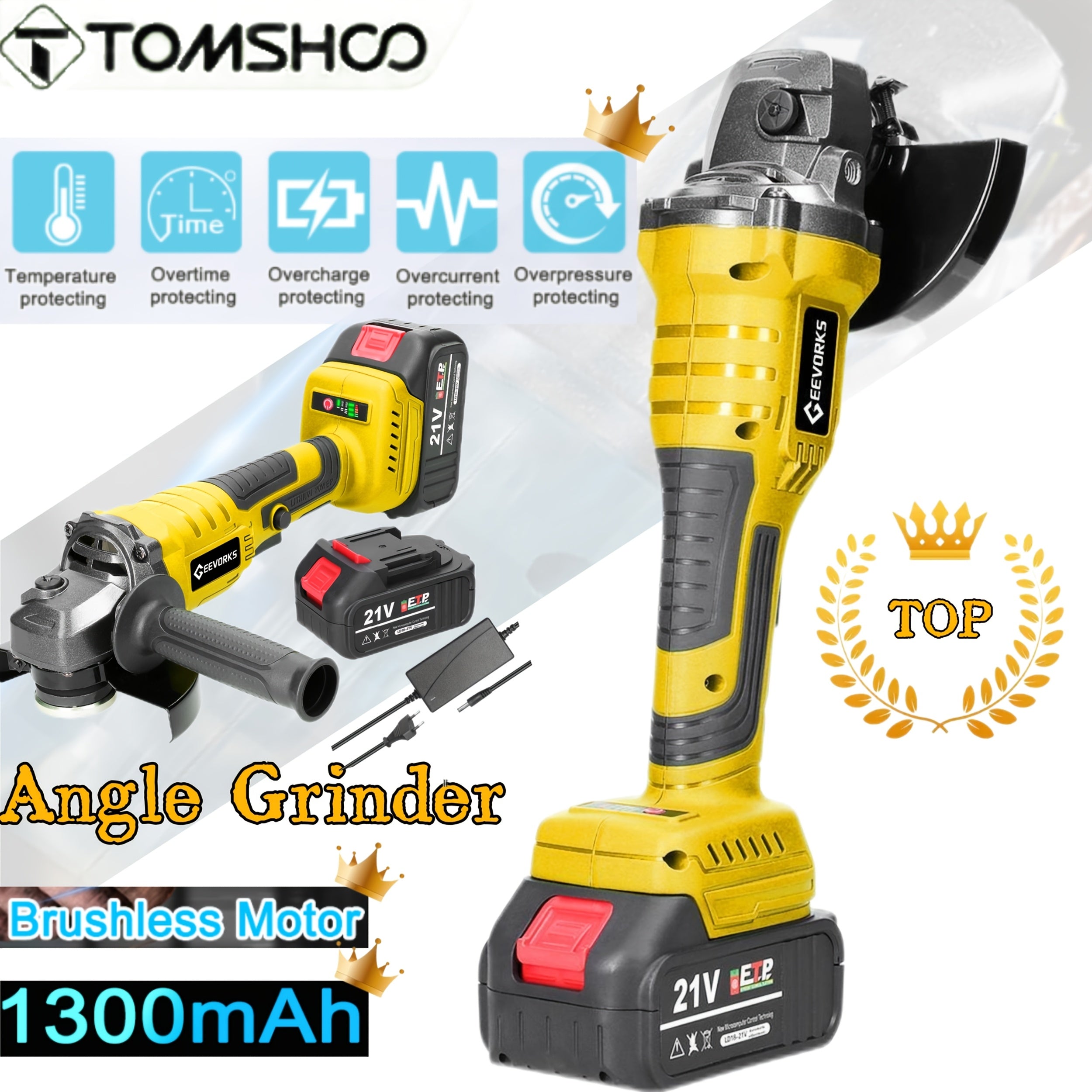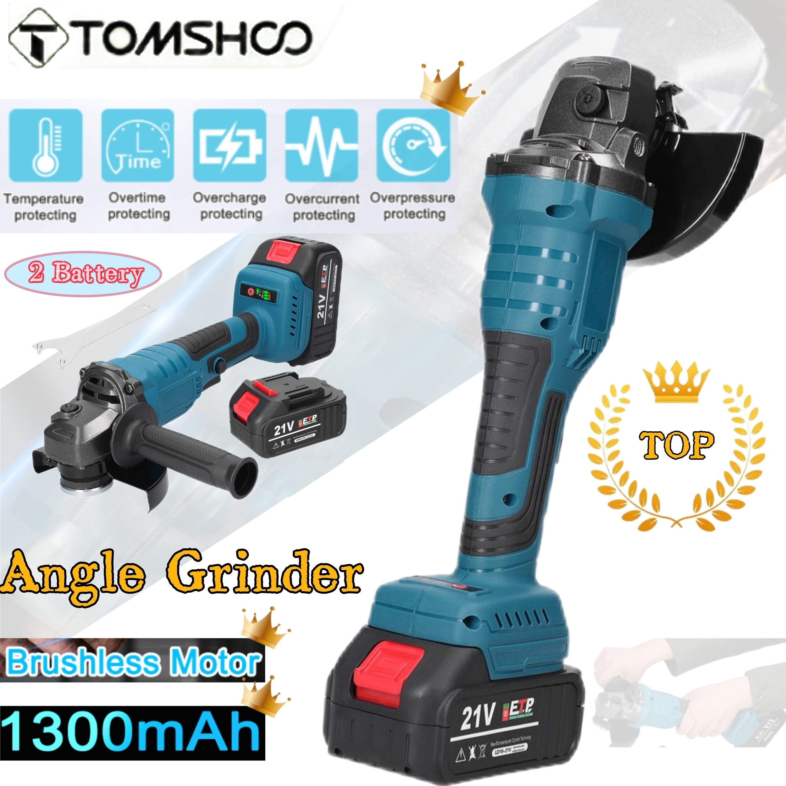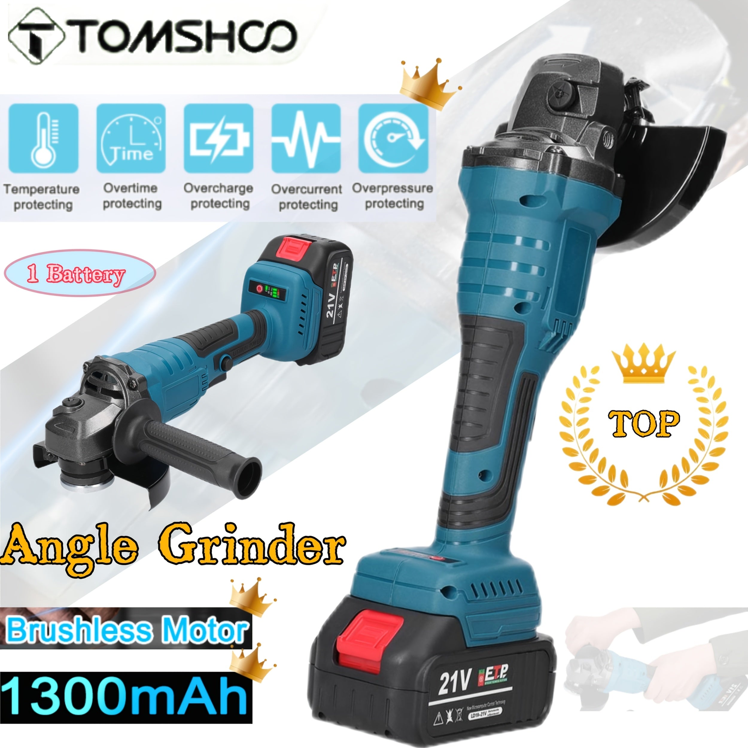 Tomshoo Smerigliatrice Angolare Senza Spazzole 21V - Strumento Elettrico Leggero per Levigatura e Lucidatura da 125mm con Batteria al Litio da 1300mAh, Protezione dal Surriscaldamento per Piastrelle, Legno, Pietra, Acciaio (Include Batteria, Presa EU 110-