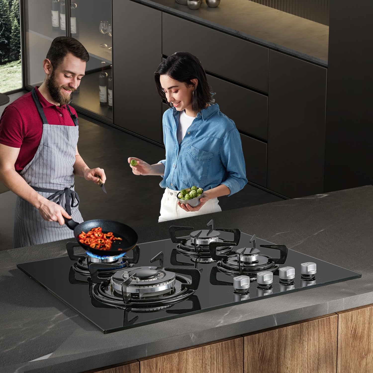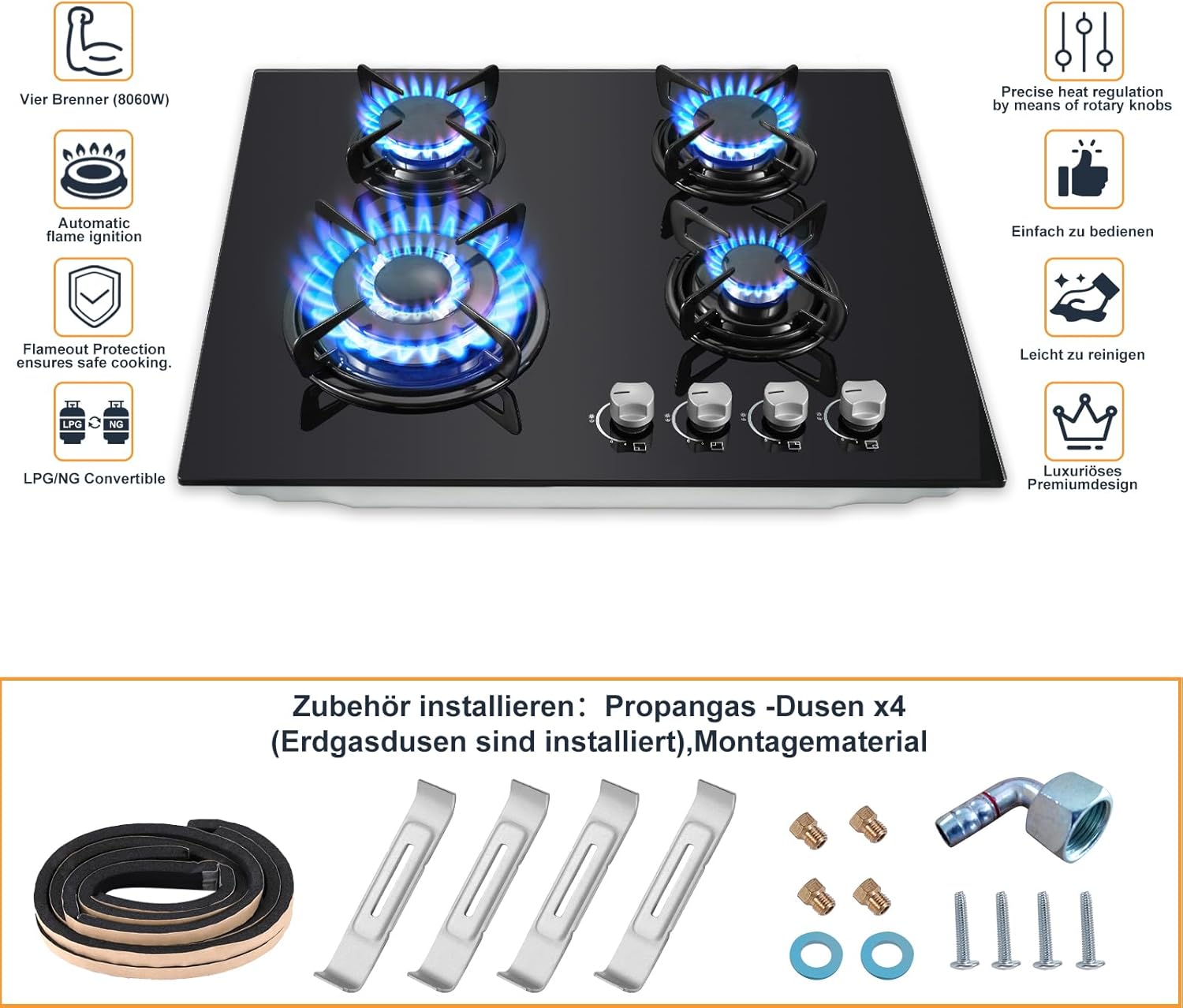 TopStrong Piano Cottura 4 Fuochi Gas, Piano Cottura Vetro Incasso, Protezione Flame-Out, 8060W, Nero, 220-240V