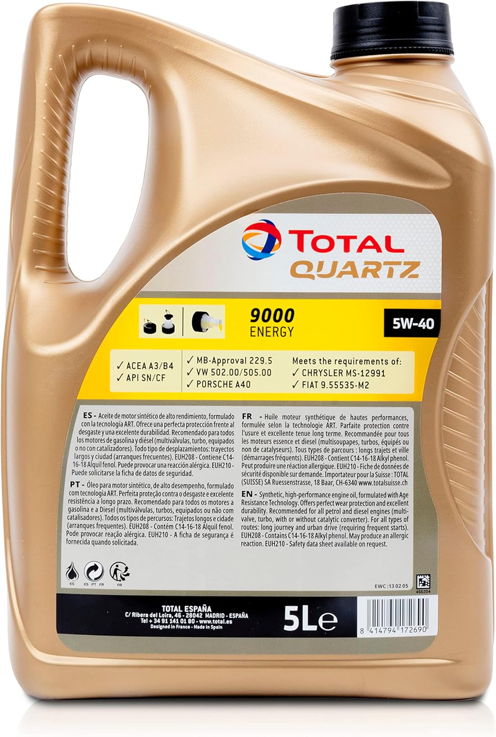 Prima di utilizzare il prodotto, è molto importante controllare la guida alla manutenzione del veicolo: il cambio dell'olio deve essere effettuato seguendo le raccomandazioni del costruttore. Il prodotto non deve essere conservato a temperature superiori ai 60°C evitando una forte esposizione ai raggi del sole, a freddo intenso o a forti variazioni di temperatura. Lo stoccaggio dei contenitori è preferibile al di fuori delle intemperie. In caso contrario, le taniche devono essere immagazzinate orizzontalmente per evitare un a contaminazione eventuale da acqua come pure l'eliminazione dell'etichettatura QUARTZ 9000 5W-40 è stato sviluppato per tutti i motori a benzina e diesel. Questo lubrificante si adatta perfettamente a motorizzazioni con turbocompressori, multivalvole e iniezione diretta. QUARTZ 9000 5W-40 è adatto per le condizioni di utilizzo più difficili (autostrada, intensa circolazione urbana...), in qualsiasi momento dell'anno. Questo prodotto è perfettamente adatto per motori dotati di catalizzatori e compatibile con qualsiasi motore che utilizza carburante senza piombo o gas di petrolio liquefatto (GPL).