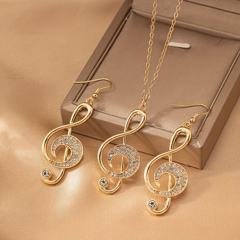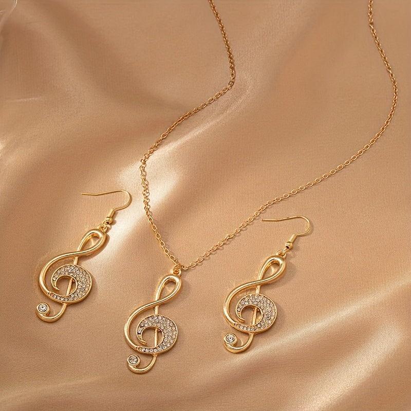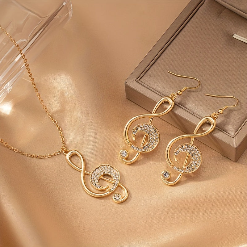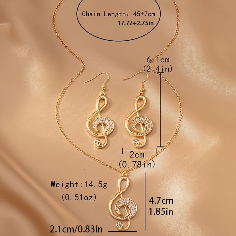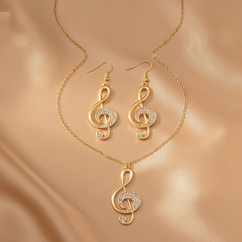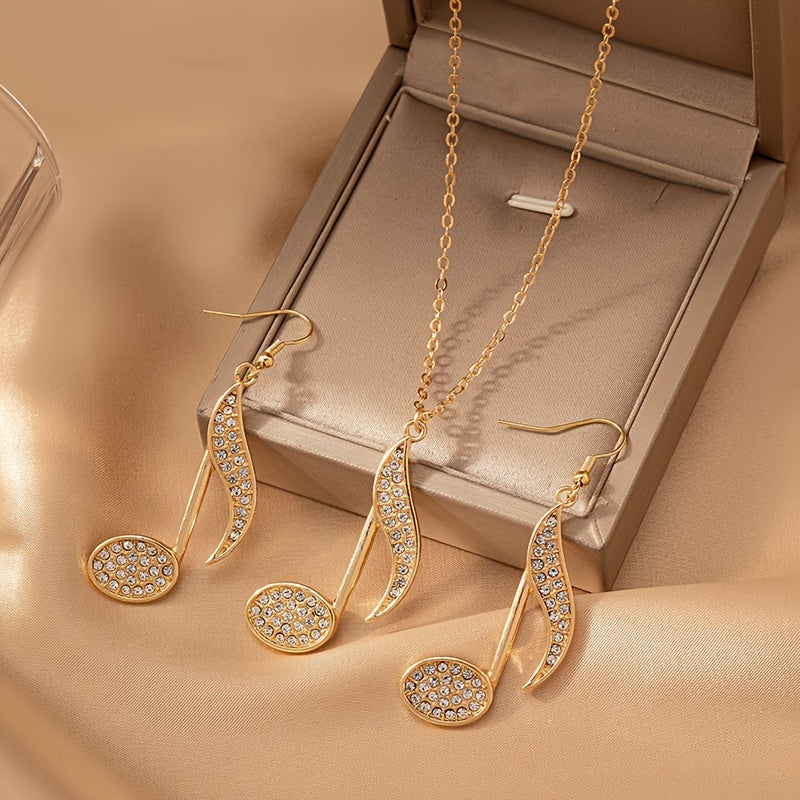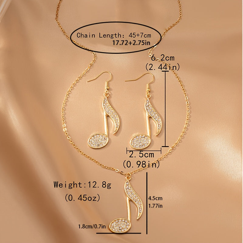 Una collana elegante e un paio di orecchini con pendenti a forma di nota musicale creativa, adornati con strass, perfetti per feste e riunioni.