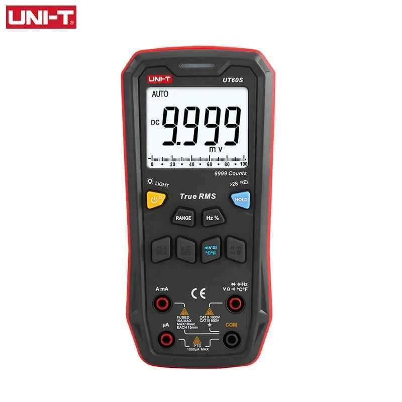 UT60S UT60BT digital smart multimeters provide True-RMS measurement, 9999-count resolution, non-contact voltage detection and many convenient features for users’ testing needs. These auto-ranged meters can measure up to 1000V AC/DC voltage, 10A AC/DC current and 100MΩ resistance. The easy-to-use interface with backlight enables you to detect equipment quickly even in dark places.