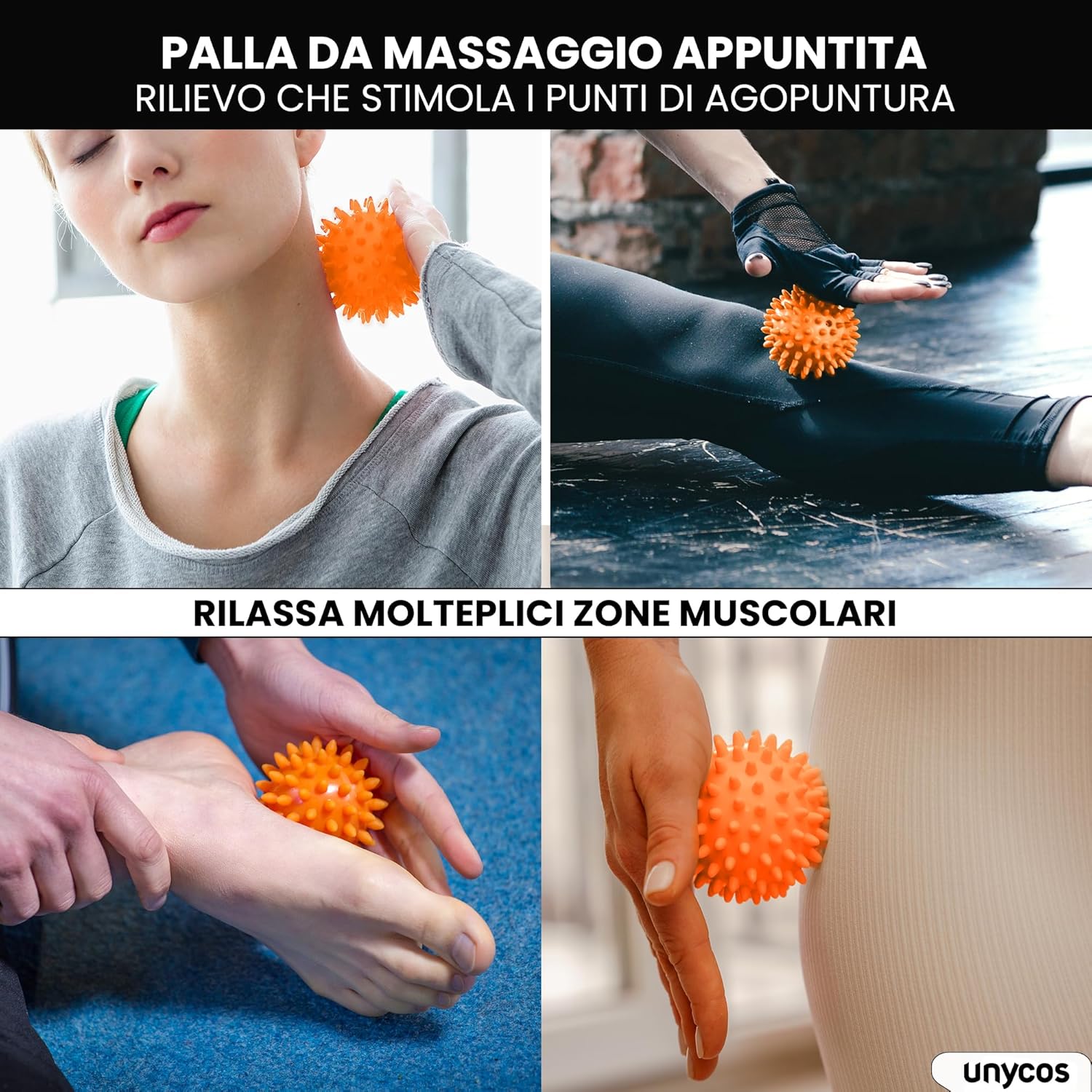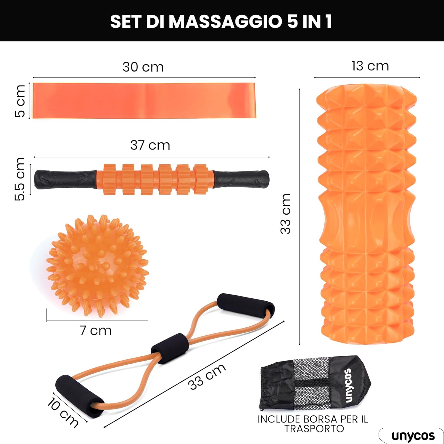 unycos - Foam Roller【PP/EVA】| Kit 5 in 1, Rullo per Massaggio Muscolare che Supporta 120 kg, Fascia di Resistenza Fitness, Palla, Bastone di Riabilitazione, Corda di Forma e Custodia (Arancione)