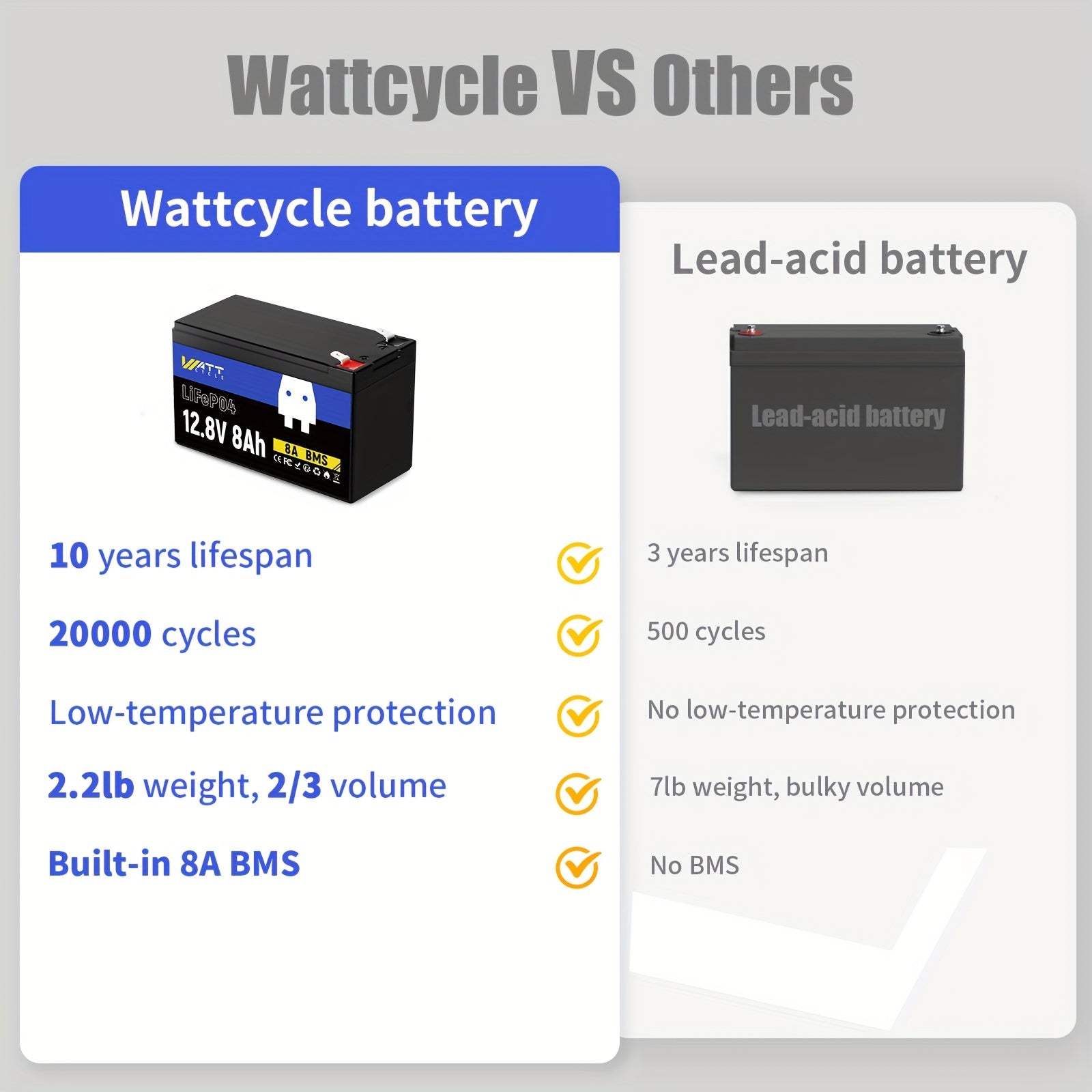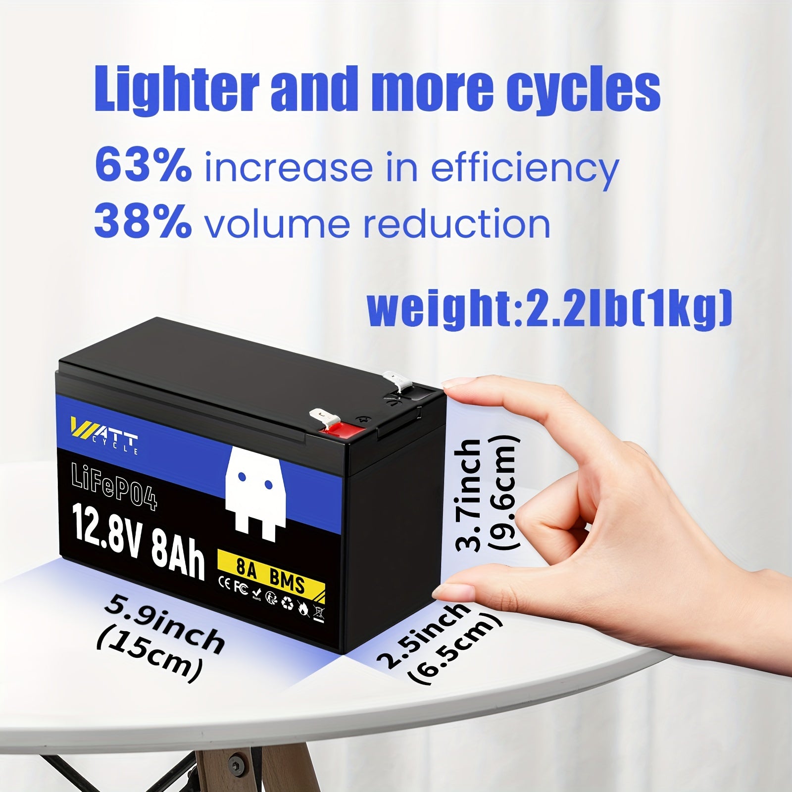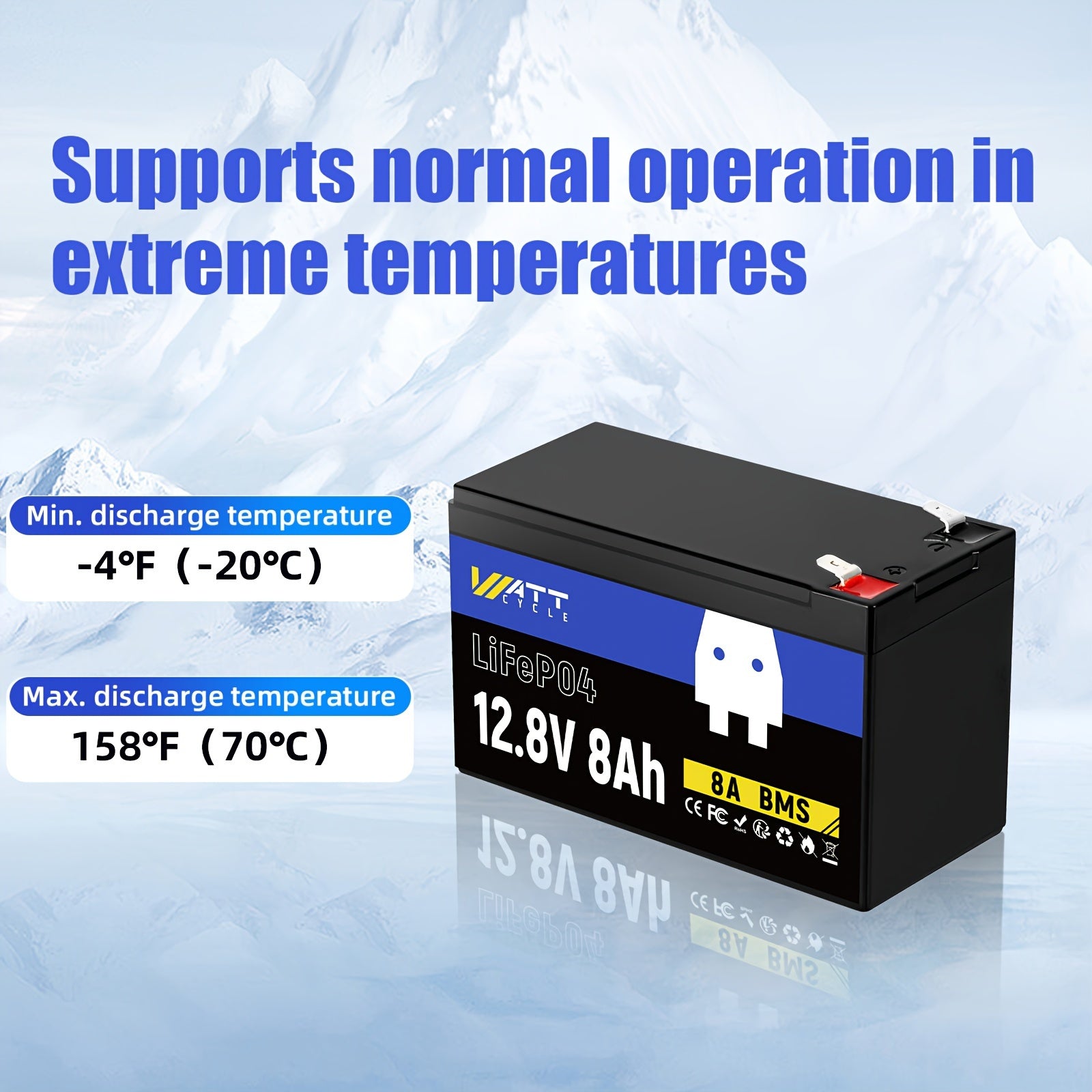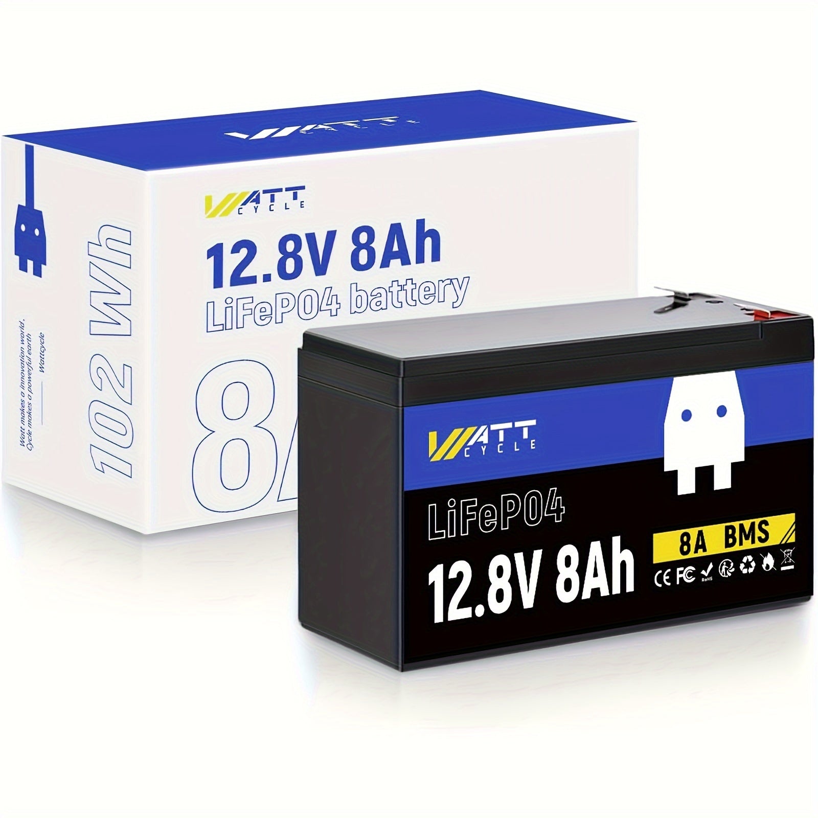 WattCycle Batteria LiFePO4 12V 8Ah - Batteria al Litio-Polimero Leggera con Celle EV-Grade A+, Protezione BMS 8A Anti-Supercharge/Scarica Integrata, Resistenza a Bassa Temperatura - per Telecamere di Sicurezza, Sonar, Camper, Nautico, Dispositivi IoT - De