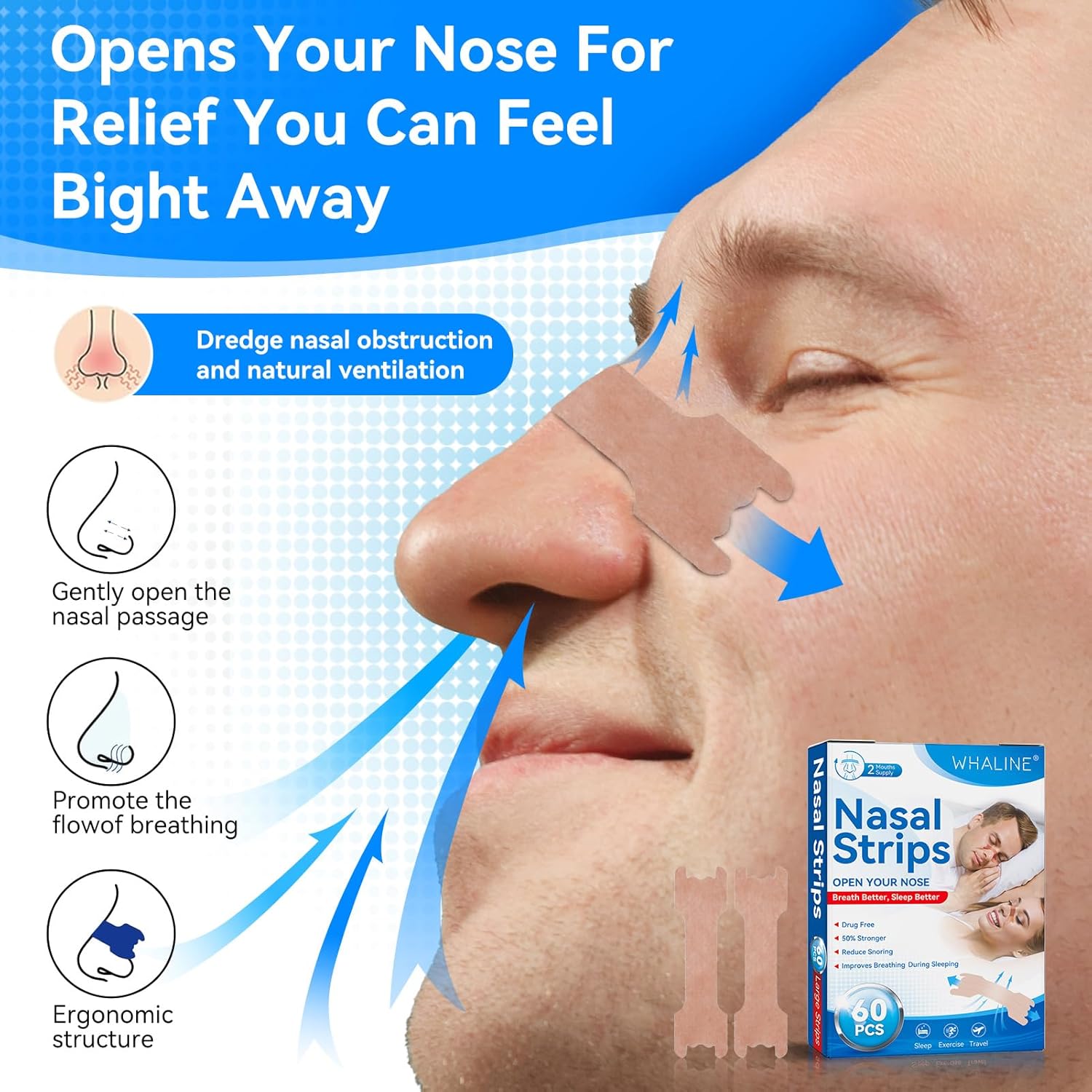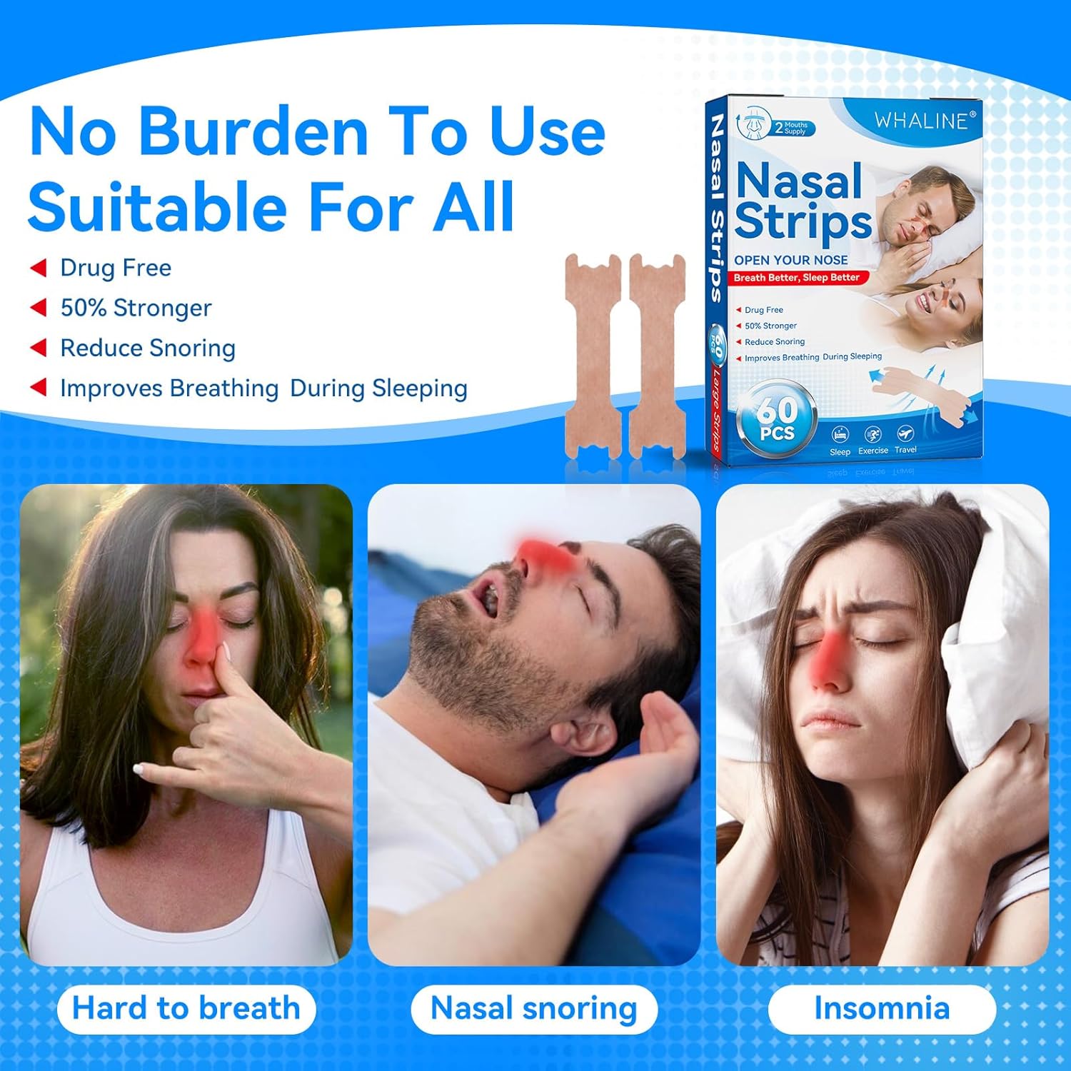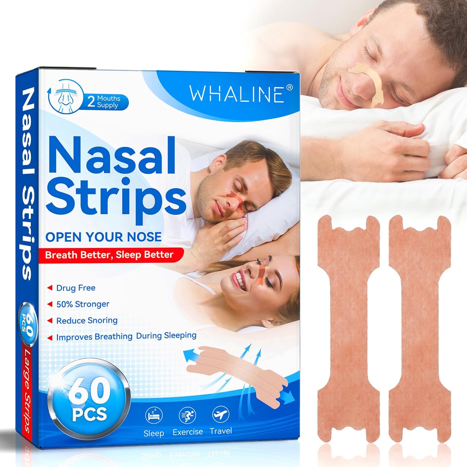 Whaline Cerotti Nasali 60 Pezzi,Cerotti Nasali Antirussamento Cerotti Nasali Respira Bene Grandi Cerotti Nasali Antirussamento Naso Antirussamento Contro Il Russareper Una Sonno,Migliore Respirazione