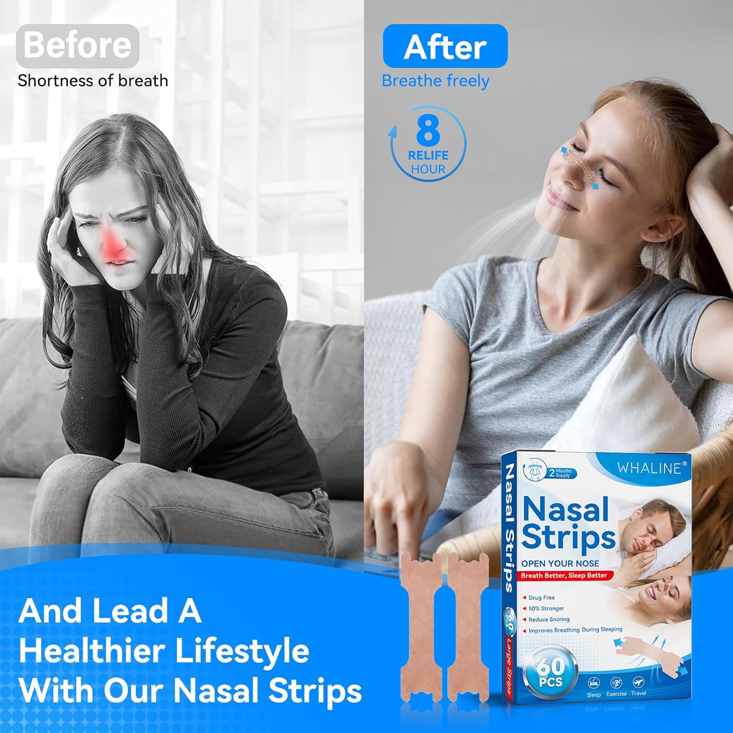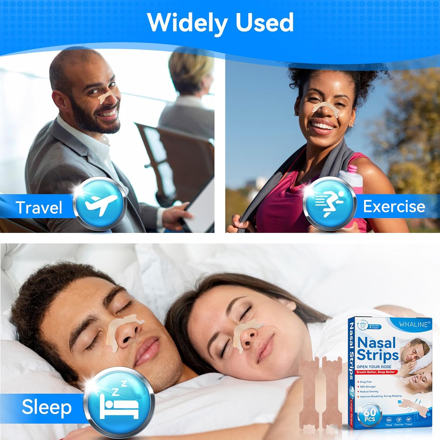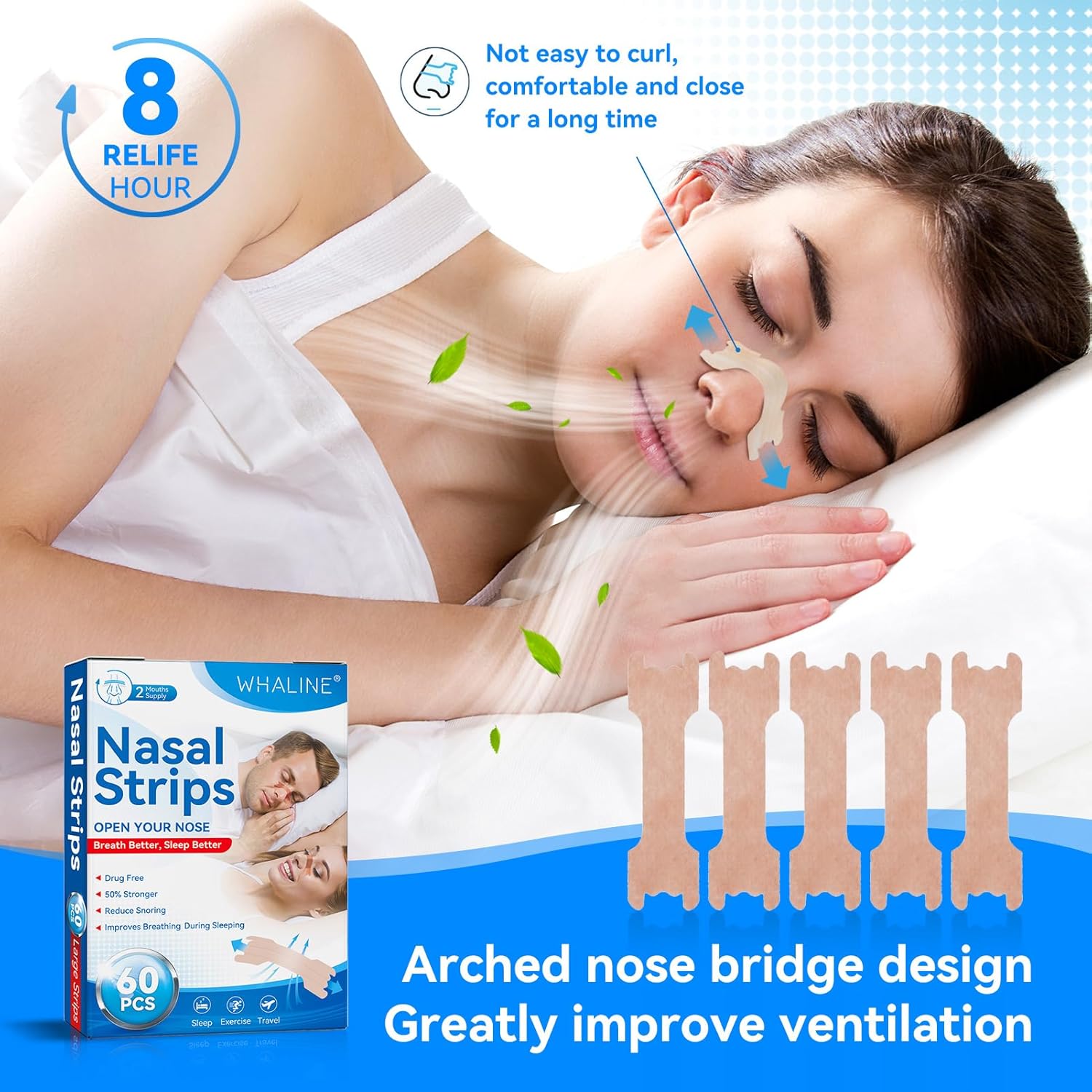 Whaline Cerotti Nasali 60 Pezzi,Cerotti Nasali Antirussamento Cerotti Nasali Respira Bene Grandi Cerotti Nasali Antirussamento Naso Antirussamento Contro Il Russareper Una Sonno,Migliore Respirazione