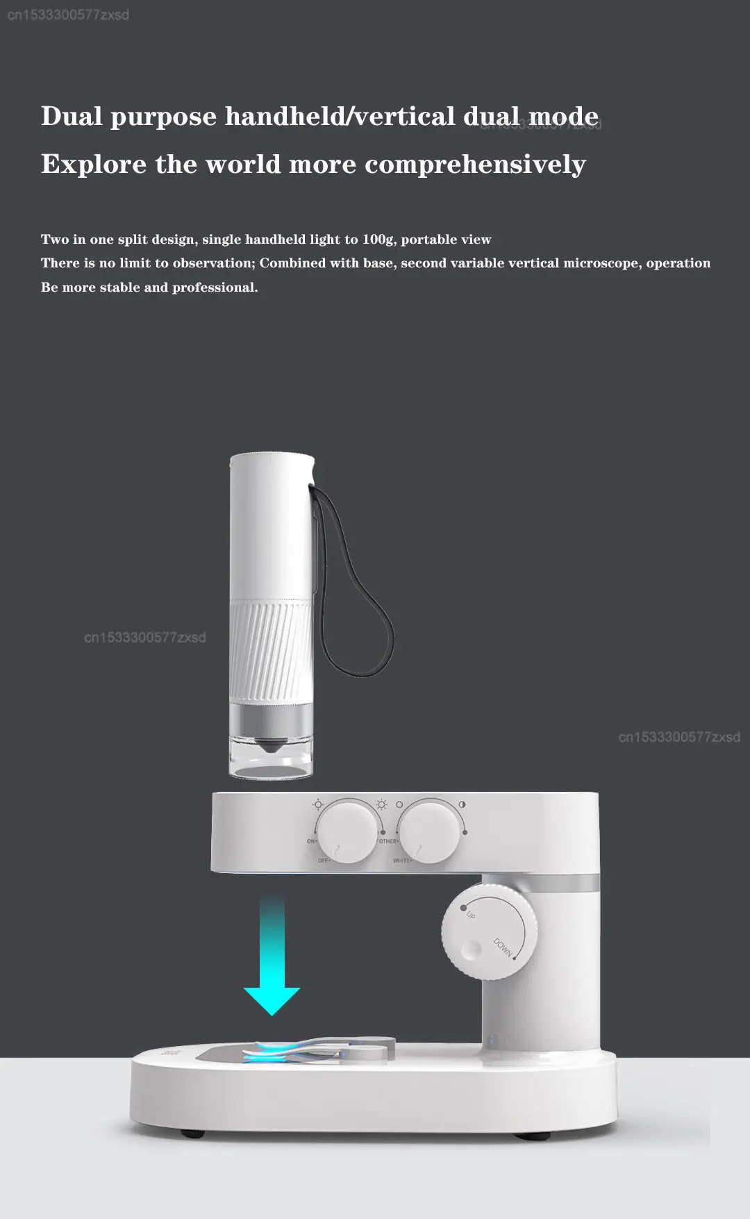 Two-in-one split design, the single handheld is as light as 100g, and the portable observation is not limited; combined with the base, it becomes an upright microscope in seconds, and the operation is more stable and professional. Upright microscope mode "lab" experience, the operation is more stable and professional, the base can assist to observe the specimen, and the image is clearer.