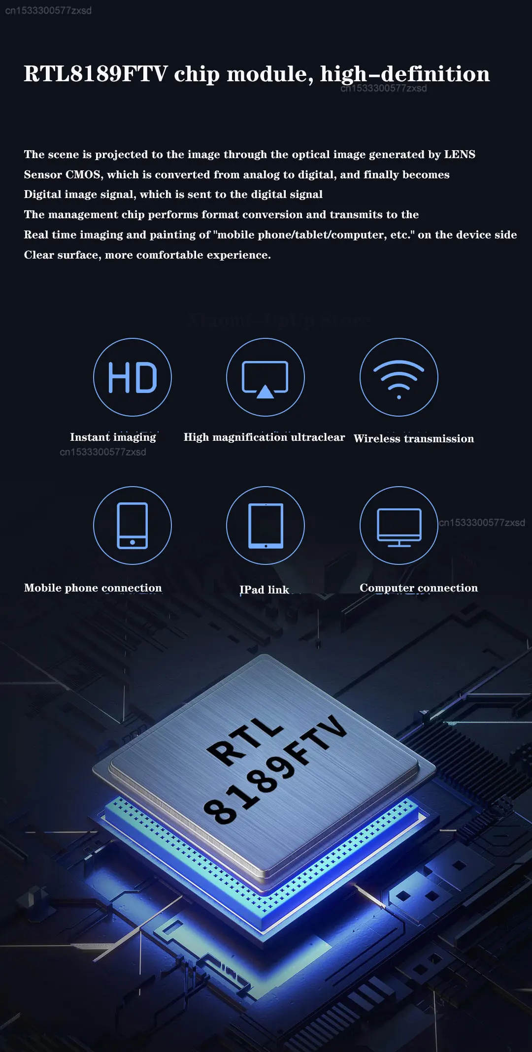The scene is projected to the image sensor CMOS through the optical image generated by LENS, and sent to the digital image signal by analog-to-digital conversion. The image signal is then sent to the digital signal processing chip for format conversion, and then transmitted to the device side "mobile phone/tablet" through the wifi port. /computer, etc." real-time display, the picture is clear and the experience is more comfortable.